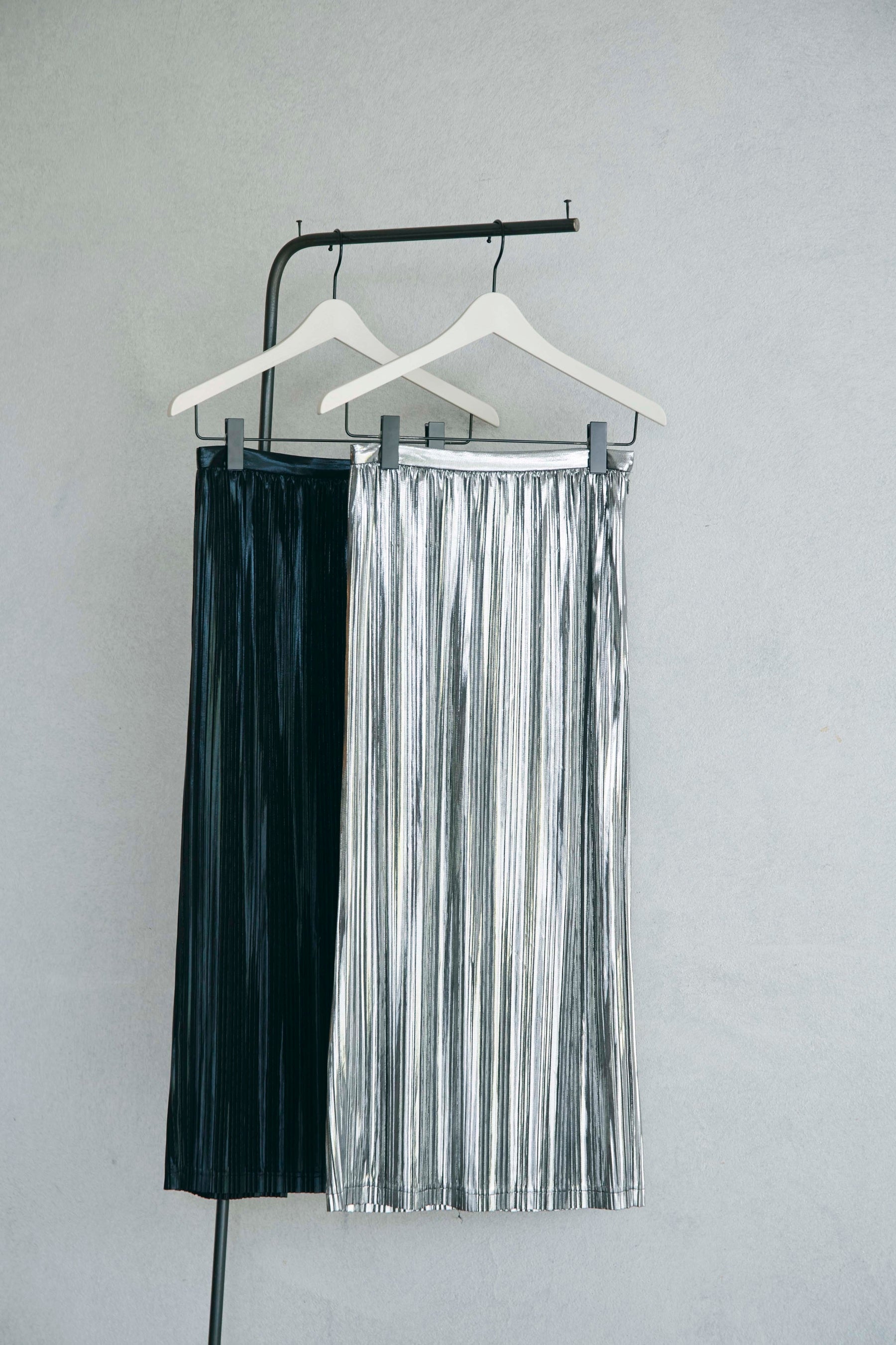 シャイニーな素材も今季のトレンド。マットに煌めくシルバーとブラックのスカートに、オーバーサイズのカジュアルなニットを合わせて。細やかなプリーツとバックに施したスリットのおかげで、足捌きもスムーズ。