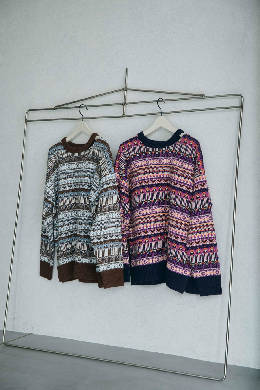 ほっこりしがちなフェアアイル柄のニットだけれども、両サイドの深いスリットや左肩の斜めスリットを効かせたことで軽快な1枚に。ベーシックカラーに挿したヴィヴィッドカラーの糸も、抜け感をもたらす後押しに。