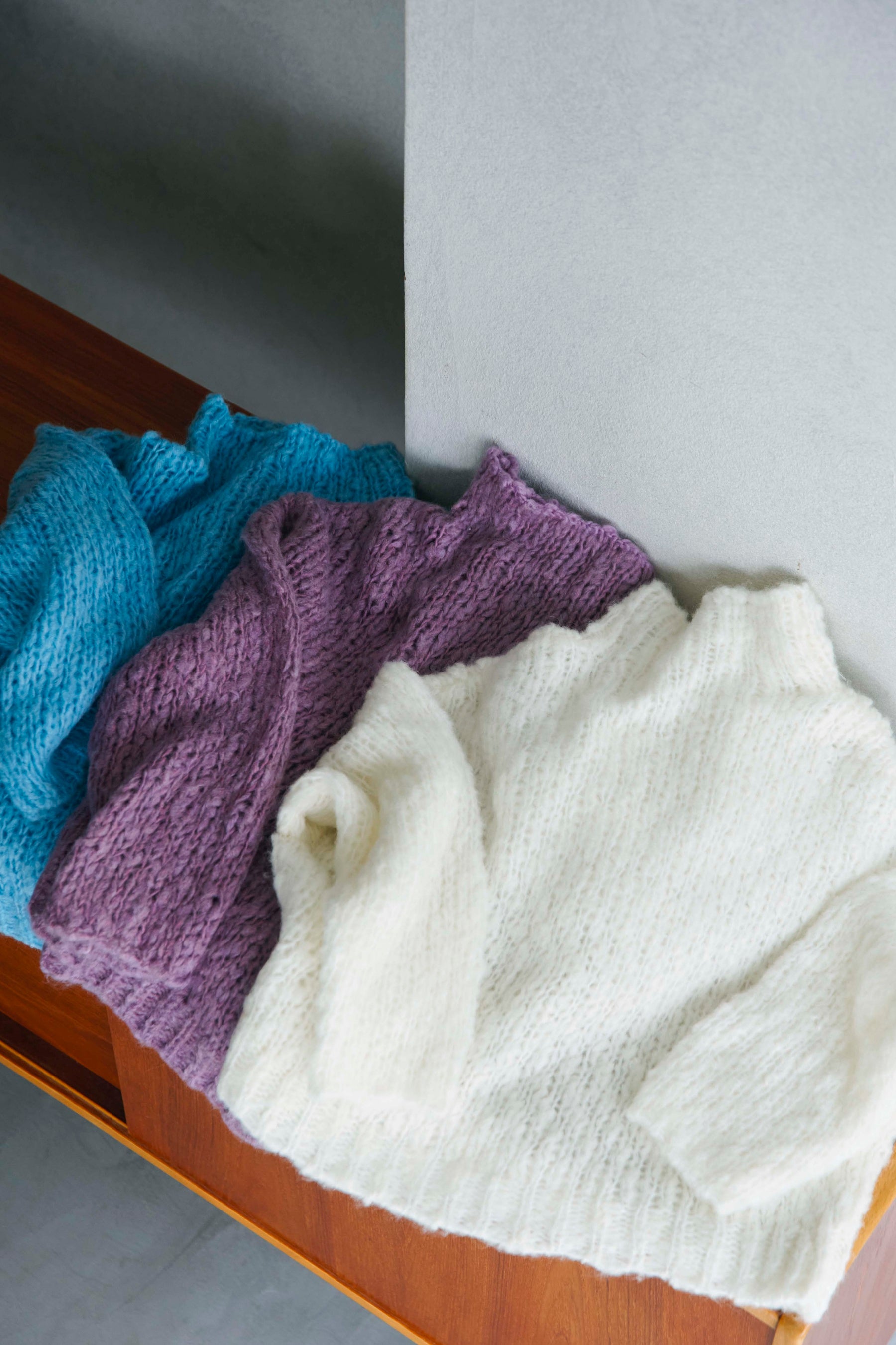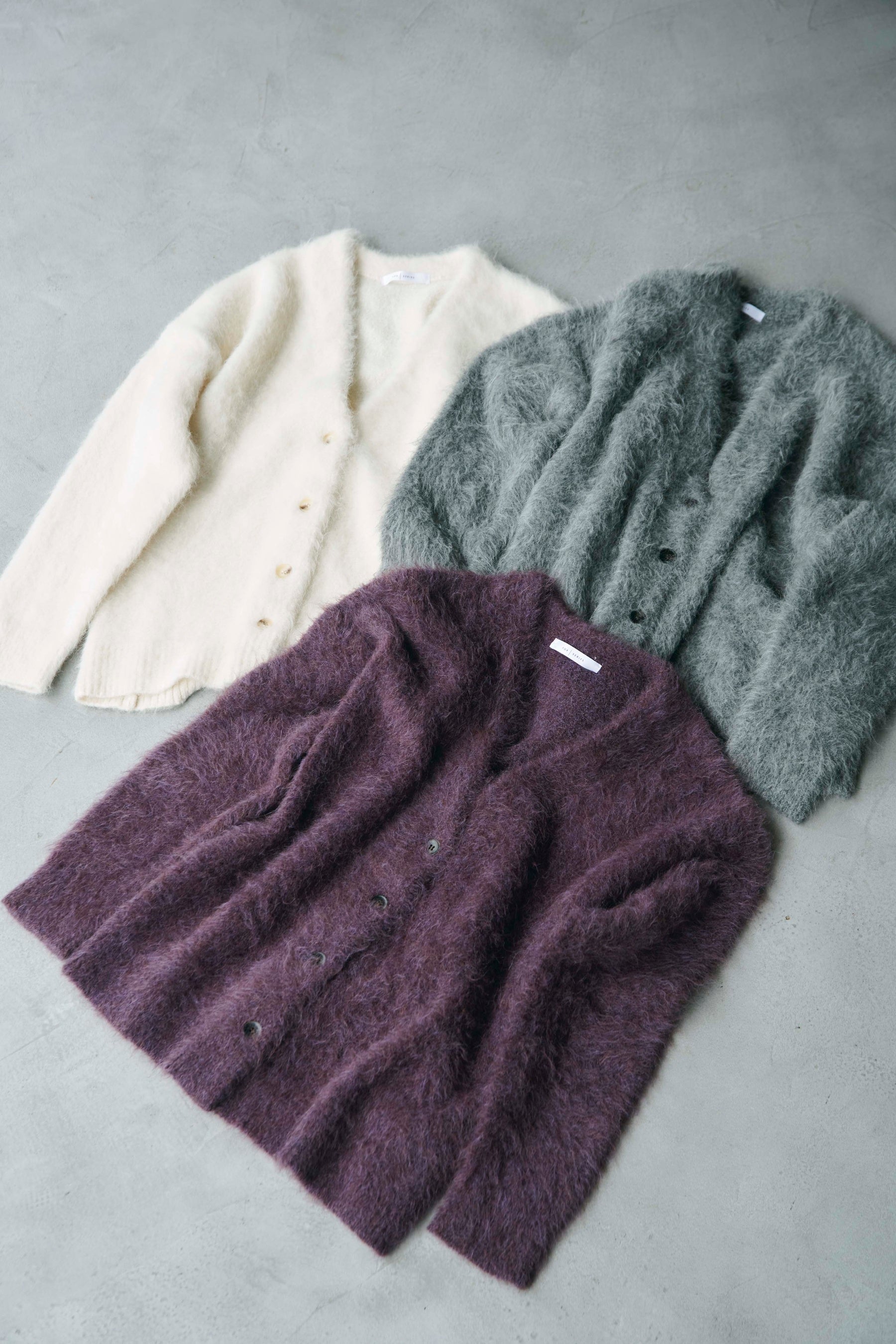 ポコポコとしたモヘア糸をざっくり編んだニット。華奢な肩に沿い、袖にはボリューム感を持たせ、丈はコンパクトにすることで抜け感をプラス。タンクトップやキャミソールを忍ばせるのはもちろん、ロンTとのレイヤードも素敵。