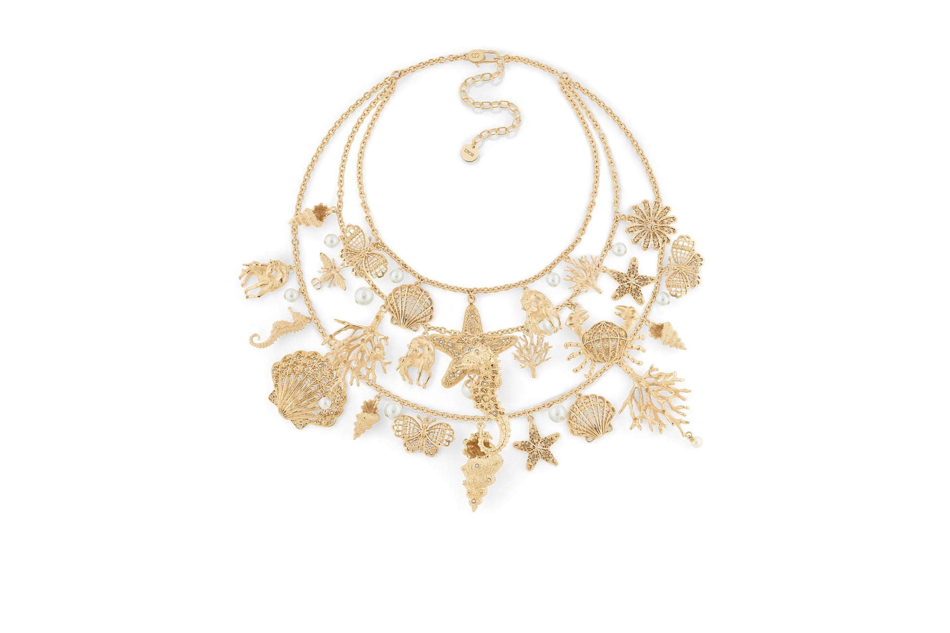「ディオール キャビネ ドゥ キュリオジテ」と名付けられたネックレスは、「ソートワール (フランス語でロングネックレスのこと)」を思わせる洗練されたデザインに、12粒の艶めくホワイトパールをバランスよくちりばめました。中央に輝くのは、精緻な細工ヒトデ、その周りをタツノオトシゴ、サンゴ、貝、カニといった海の生き物などが取り囲み、花や蝶、ユニコーンがその構成を一層引き立てます。これらはすべてワックスで原型が作られた後で円筒状の型に入れて溶かされ、最初のバージョンをさらに加工することで、完成に導かれます。