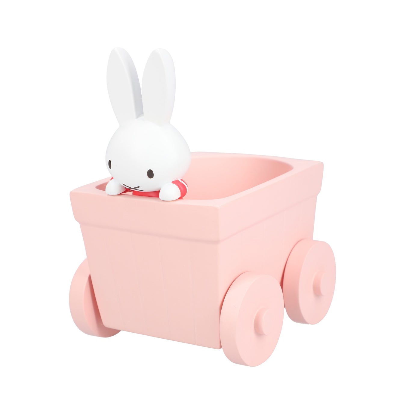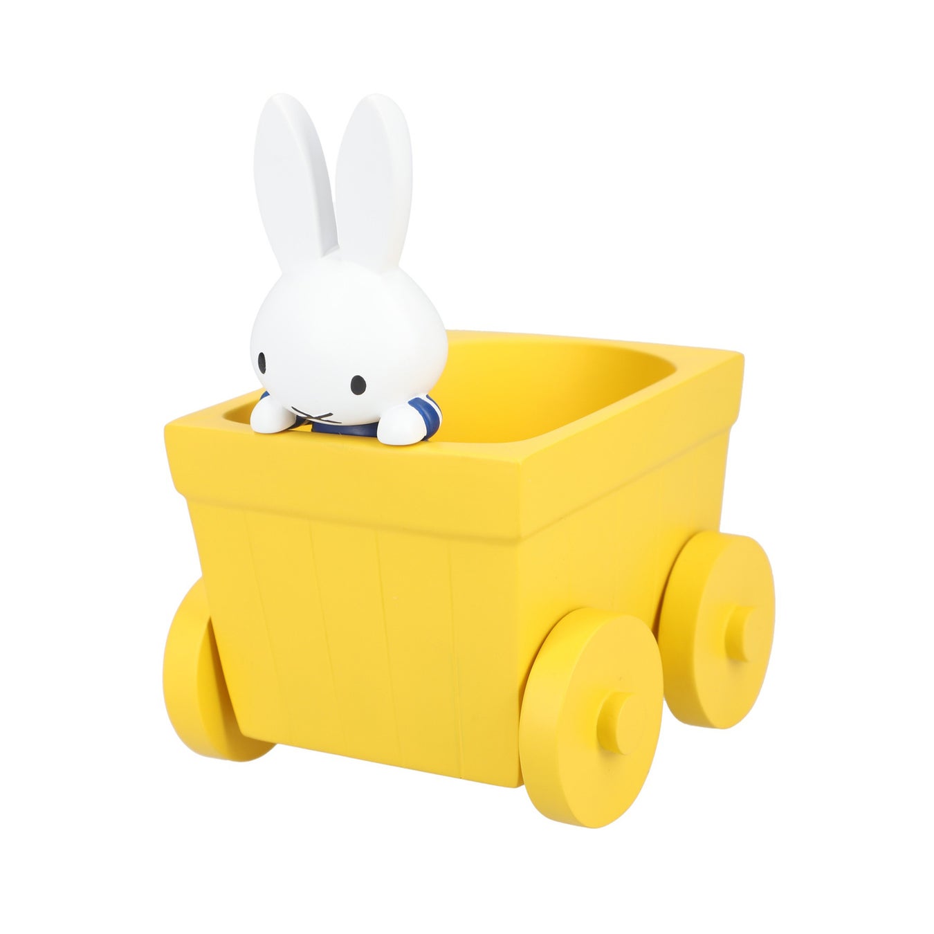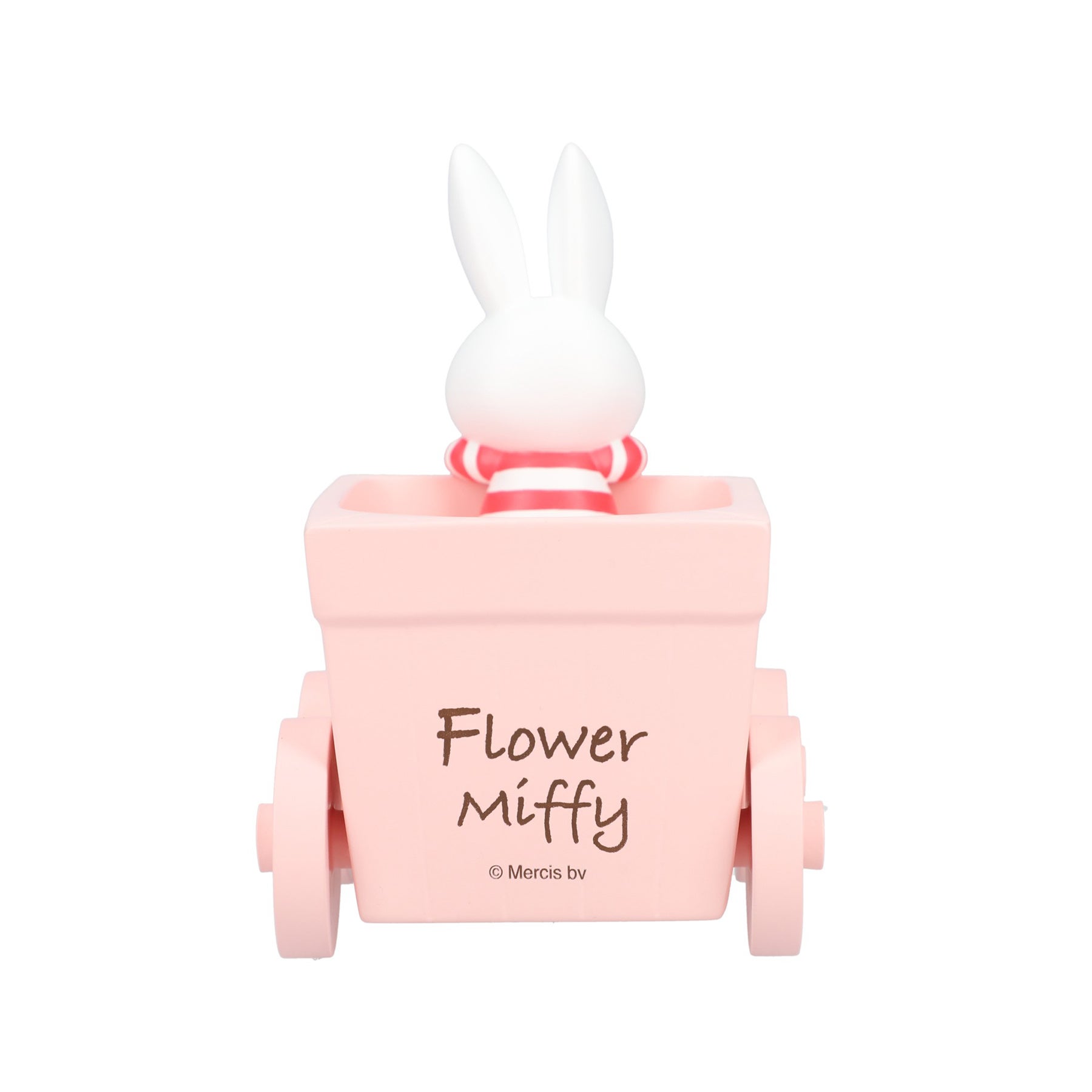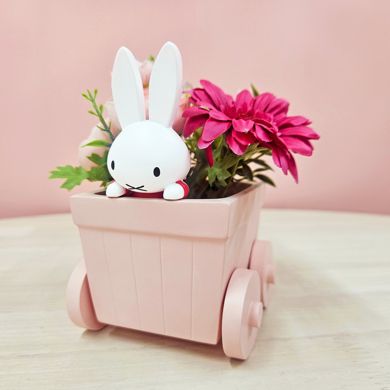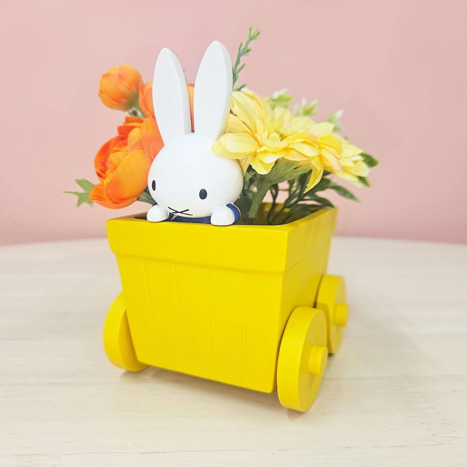 くるまがモチーフのイエローとピンクのプランターです。後ろにお花を入れると、ひょっこりと顔を出すミッフィーが花車で運ばれているように見えます。リビングの棚やデスクなど、どの空間にも馴染みやすい両手に収まるサイズです。お花を飾ったあとは、小物入れとしてもご使用いただけます。