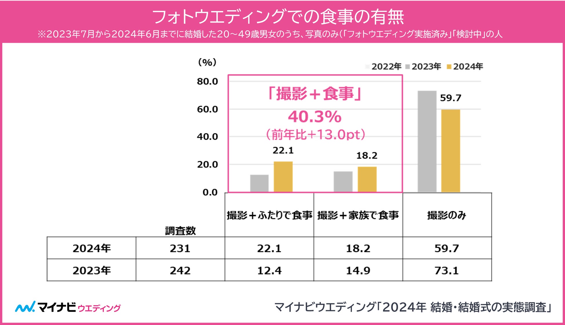 結婚式を行った・行う予定の人は約6割。フォトウエディング後に家族で集う新スタイル、「フォト会食」が人気「撮影時に食事をした」割合は前年比13.0pt増の40.3%