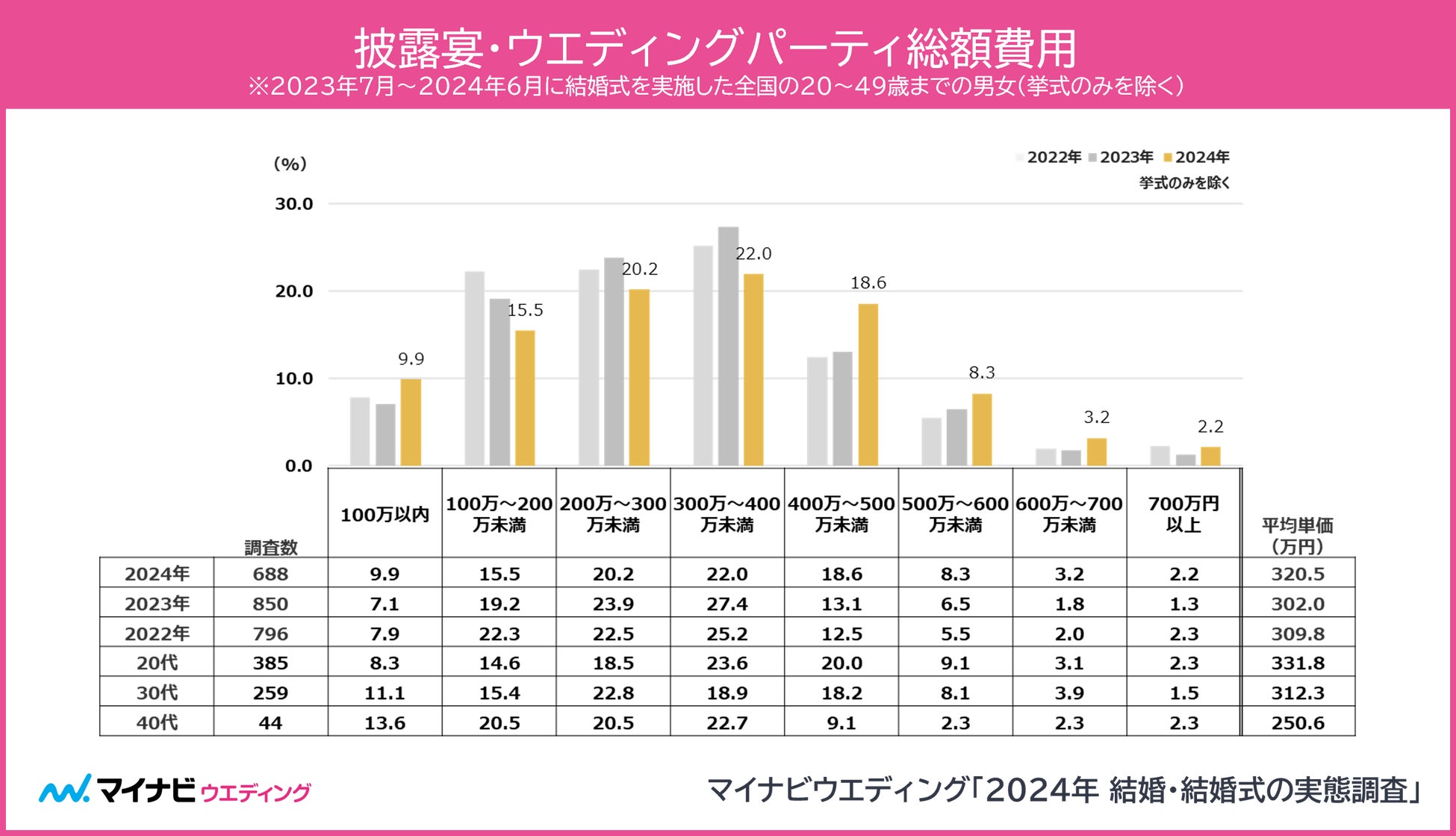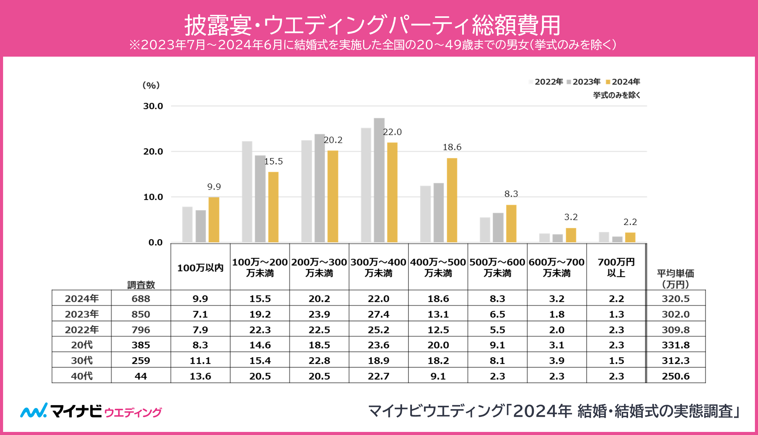 また、招待人数の増加に伴い結婚式費用も増加傾向であり、2024年の平均は320.5万円で、前年よりも18.5万円増加した。【図4】