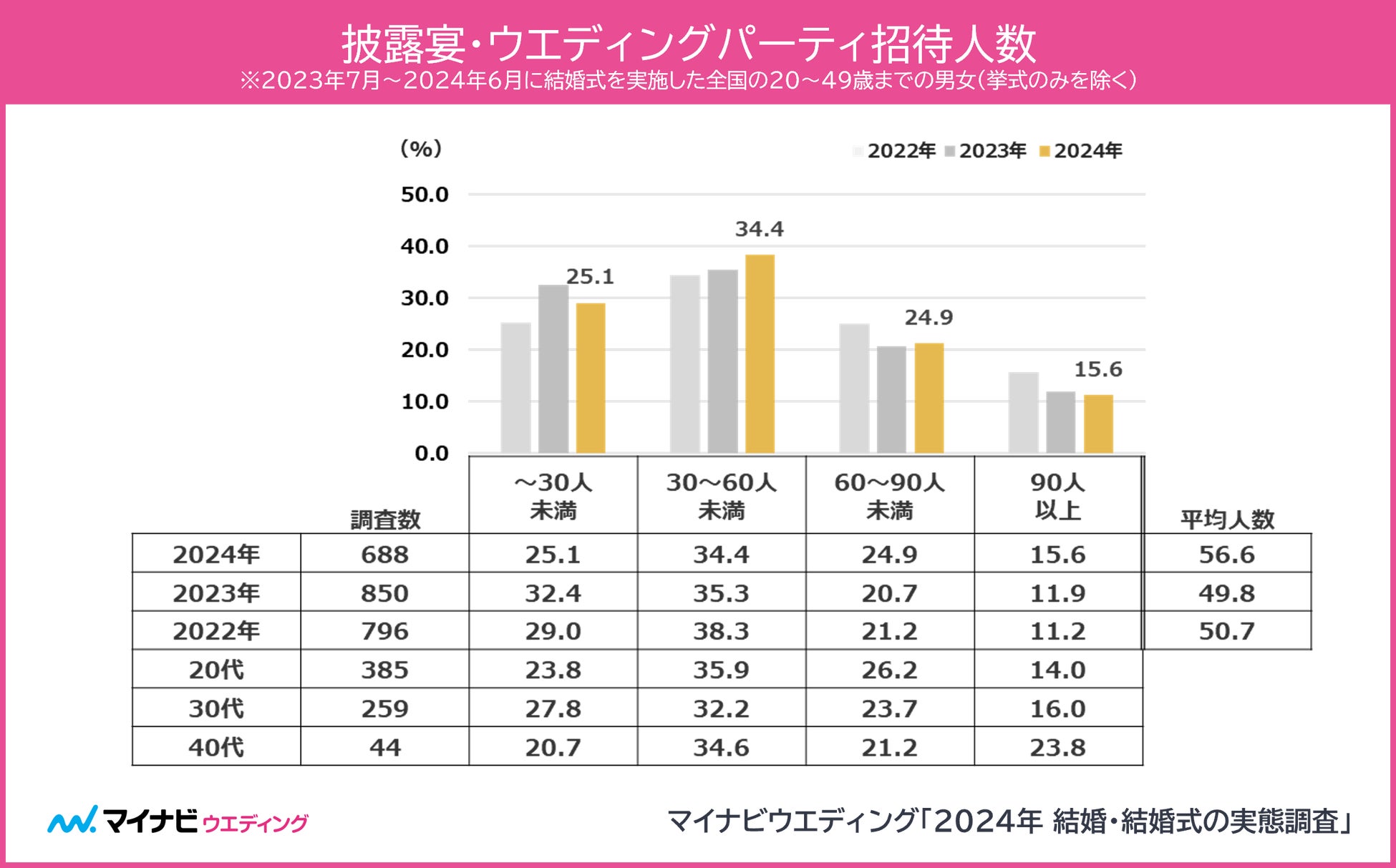 結婚式を行った人の招待人数の平均は56.6人となり、前年比で6.8人増加した。