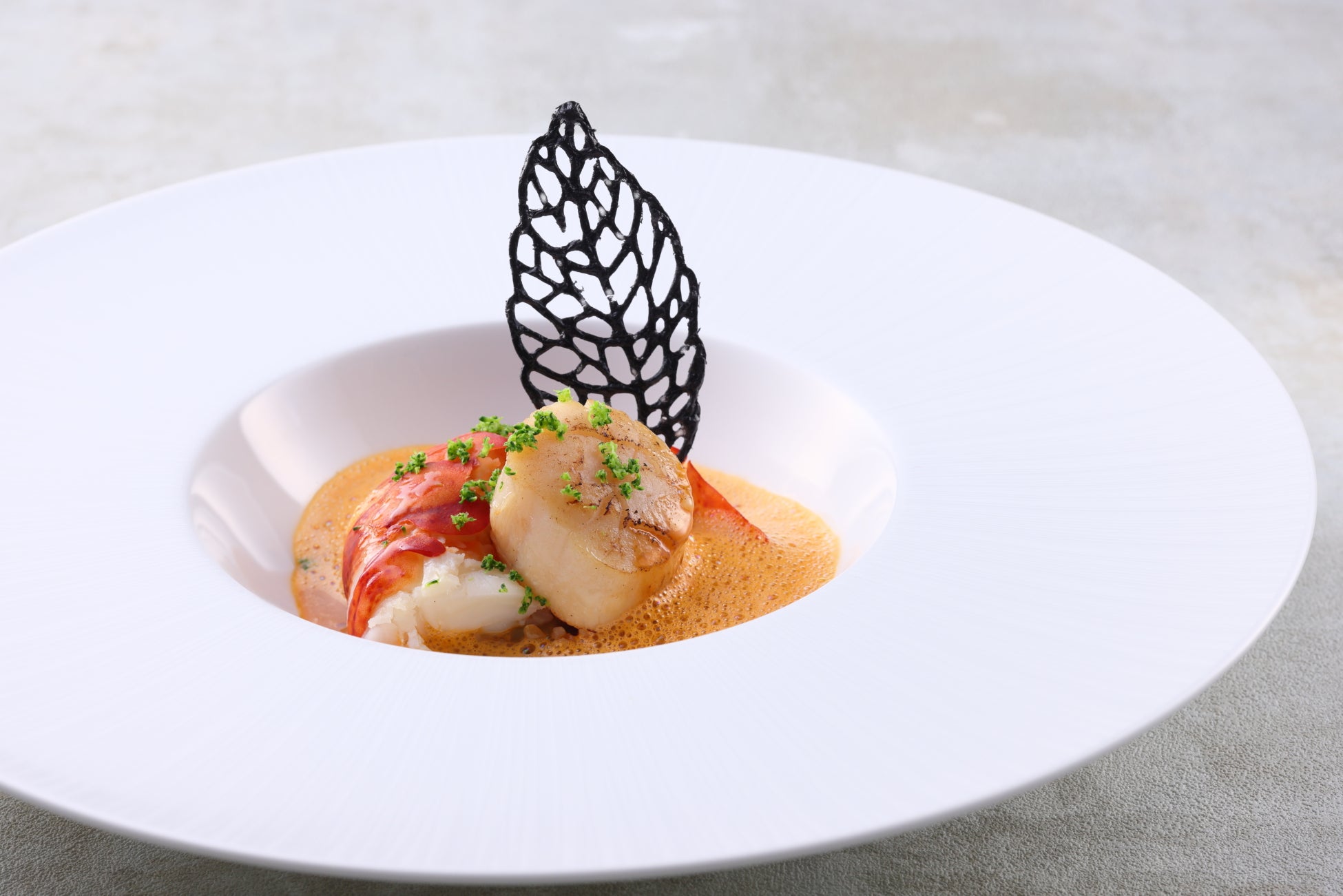 オマール海老と帆立貝のソテー ブルグルのタブレと竹炭のチュイル