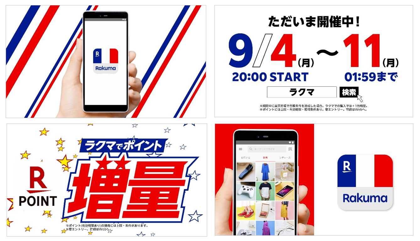 ・内容: 買いまわり数に応じて「楽天ポイント」が獲得できる「ショップ買いまわり」に加え、「楽天ラクマ」で1,000円以上の購入で、期間中の「楽天市場」および「楽天ラクマ」でのお買い物時の「楽天ポイント」の付与率が+1倍となるキャンペーン