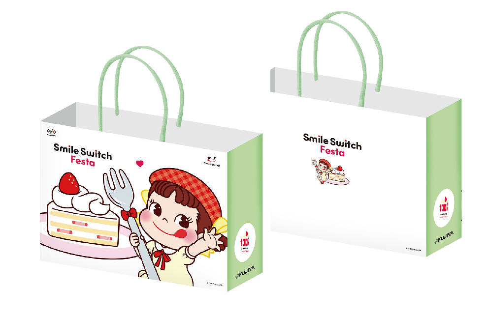 ショートケーキ発売100周年記念のキュートなペコちゃんがプリントされています。