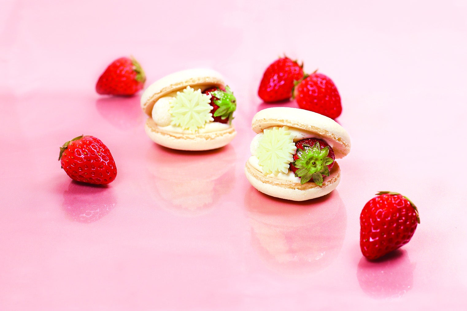 白いマカロン皮でミルキーガナッシュをサンドし、苺、生ミルキー、雪の結晶型チョコを飾りました。冬にぴったりの、雪をイメージしたキュートでスイートな味わいのトゥンカロンです。