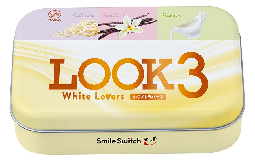「ルック3(ホワイトラバーズ)」のパッケージをイメージしたデザイン缶の中には、粒チョコレートになった「ルック3(ホワイトラバーズ)」と、2020年~2022年にかけて発売した「ルック」シリーズ商品のパッケージをピックアップし、ステッカーにしたルック フレークシール(全10種)がランダムで1枚封入されています。