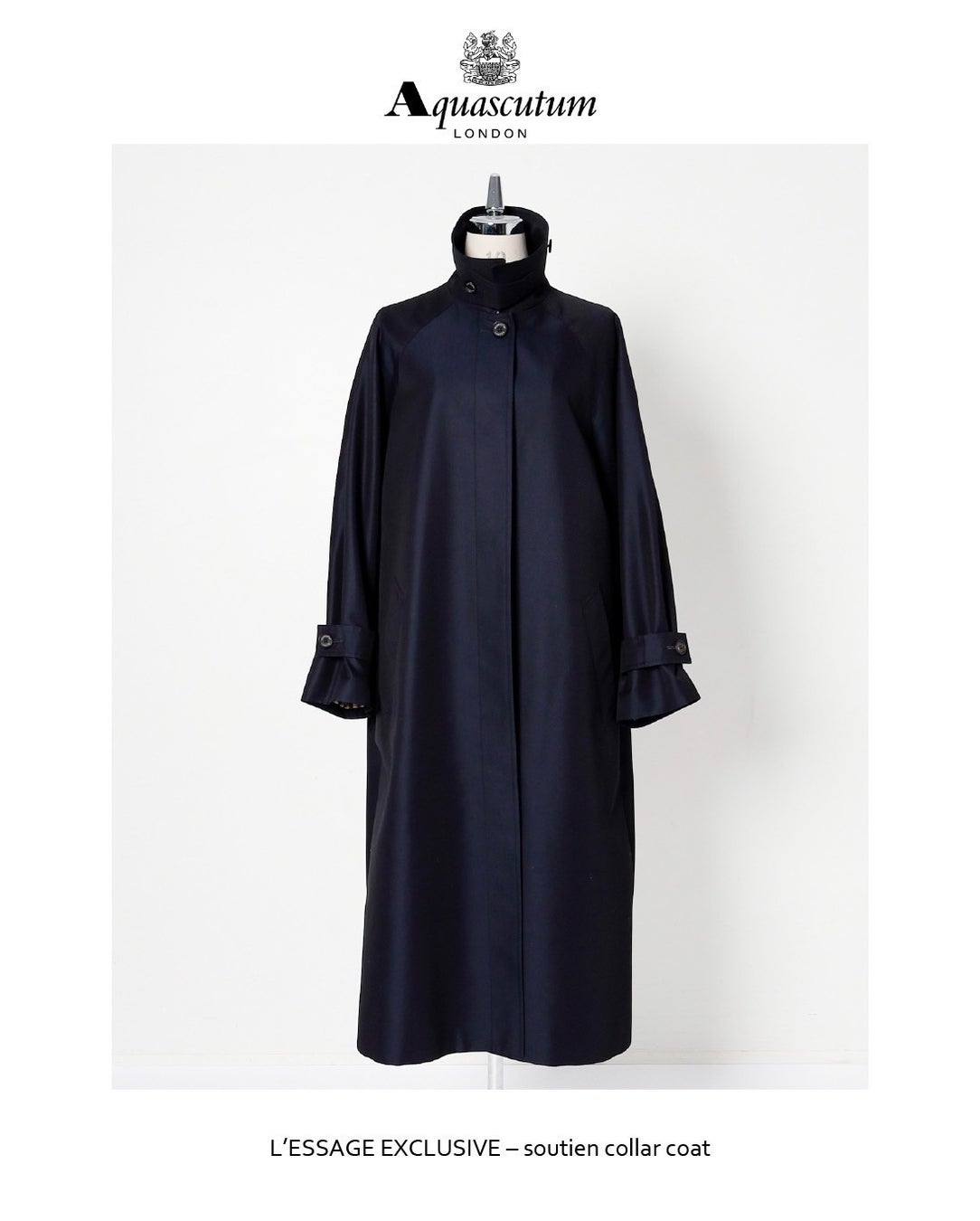 また今回特別に、同じ英国ブランド「AQUASCUTUM(アクアスキュータム)」にL'ESSAGEが別注をかけて作られたステンカラーコートも同時にご紹介します。こちらはL'ESSAGEの通常のショップでは早くも完売間近の人気アイテムとなっております。NAVYとBEIGEの2色でのご用意です。