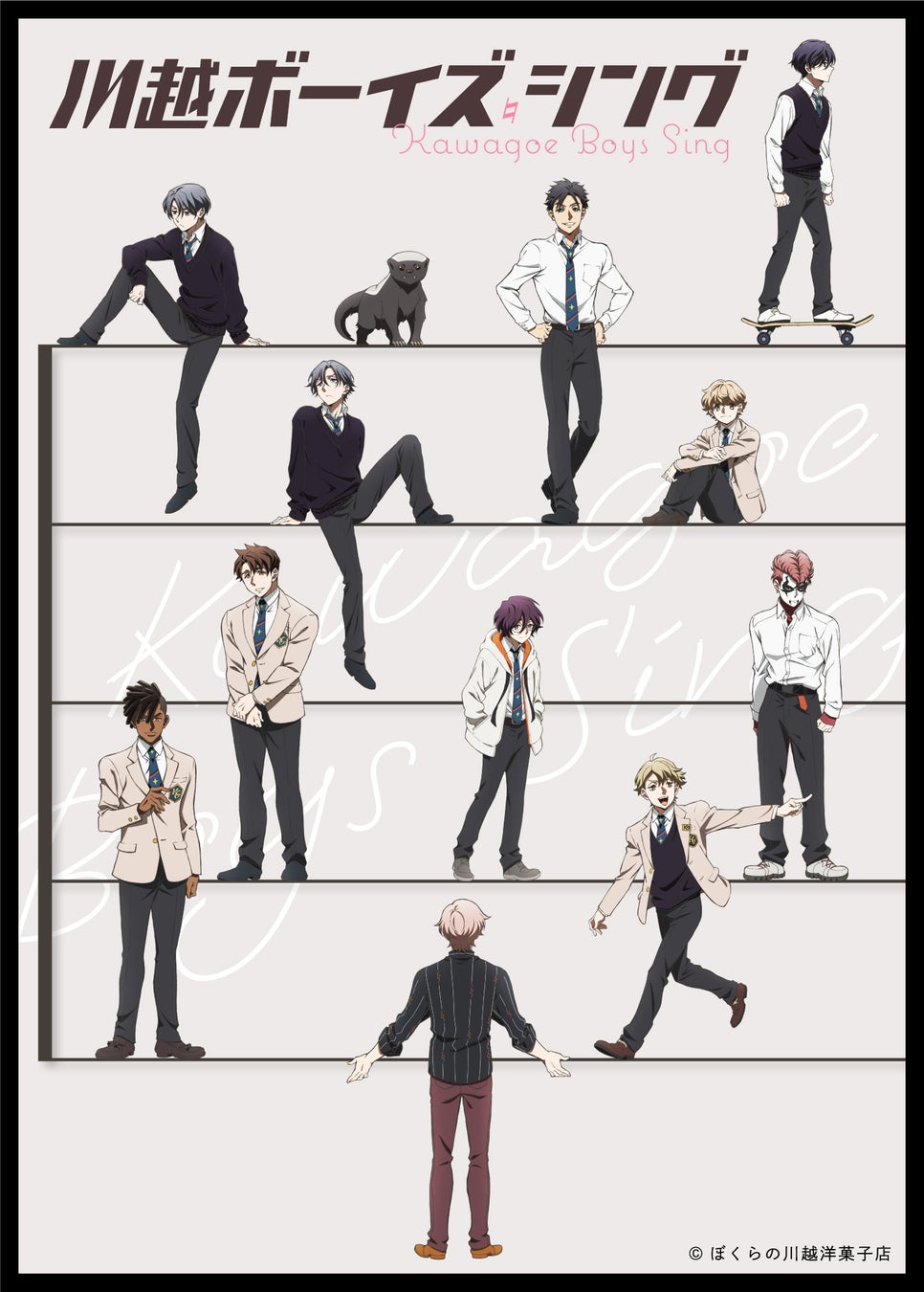 「川越ボーイズ・シング」は男子高校のボーイズ・クワイア部を舞台に、個性豊かなキャラクターたちがバラエティ豊かな楽曲を歌い上げるオリジナルTVアニメです。「全国高校ボーイズ・クワイア・コンクール」への挑戦をきっかけに、「歌」を通じて、クセモノ指揮者と男子高生たちが反発しあいながらも共に成⾧し、心を通い合わせていく姿を、笑いと涙で綴る熱血青春コメディ。