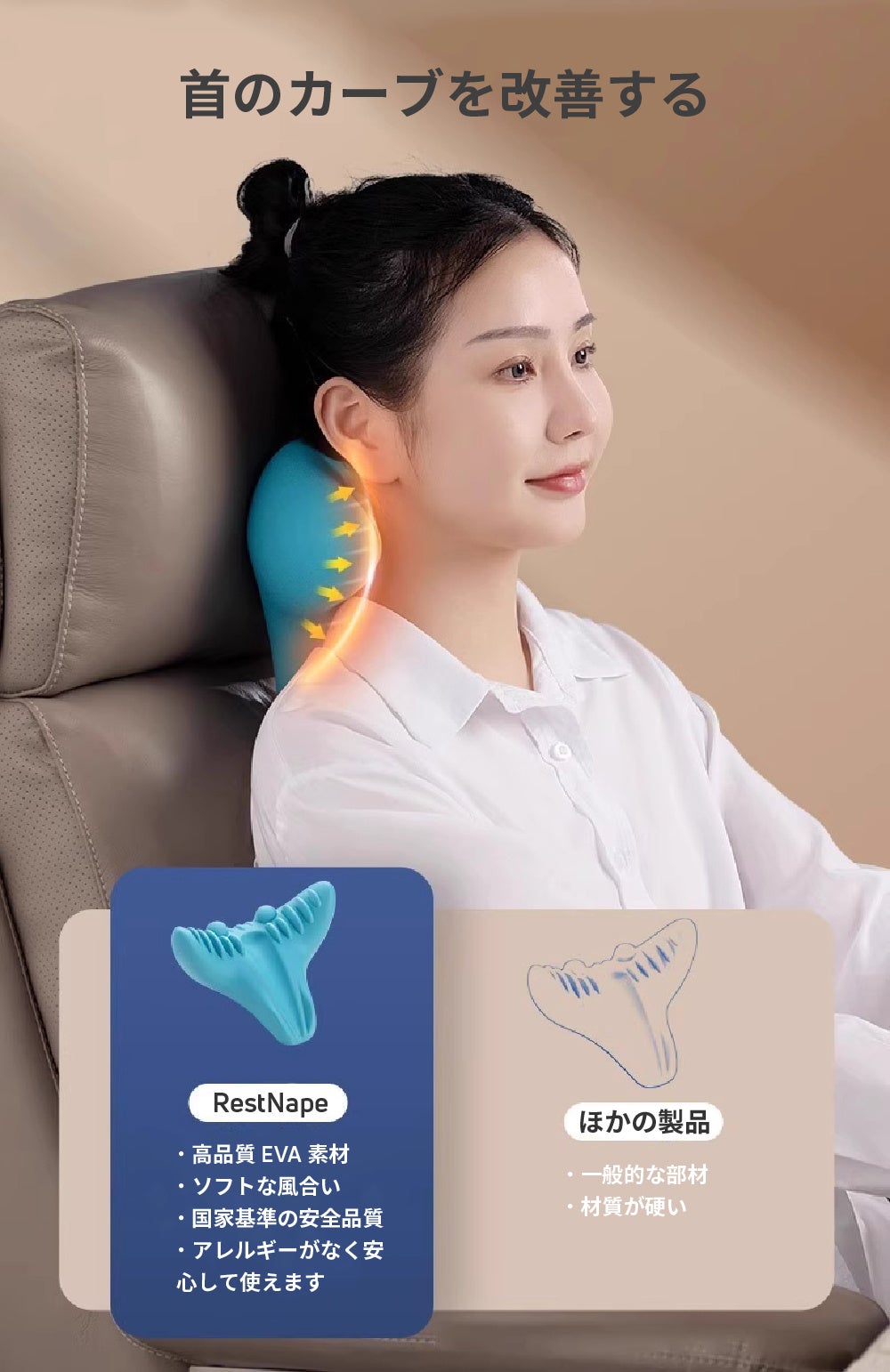 RestNapeは、頸椎に合わせたカーブデザインで首にしっかりとフィット。