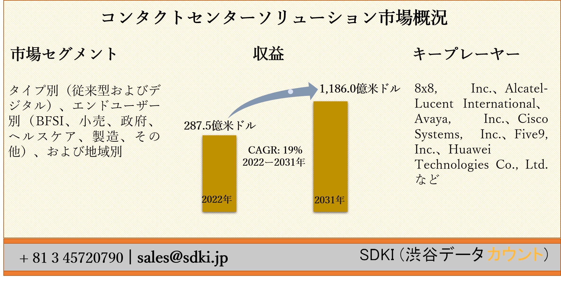 コンタクトセンターソリューション市場は、2022年に287.5億米ドルの市場価値から、2031年までに1,186.0億米ドルに達すると推定され、2022-2031年の予測期間中に19%のCAGRで成長すると予想されています。