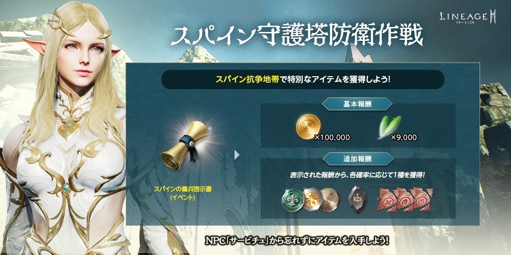 期間中、ワールド ダンジョン「スパイン抗争地帯」のロビーにイベントNPC「サービチュ(イベント)」が出現します。「サービチュ(イベント)」から、アデナを使用することで、「スパイン抗争地帯」に関連したクエストなどが啓示される、「スパインの傭兵啓示書(イベント)」を獲得できます。