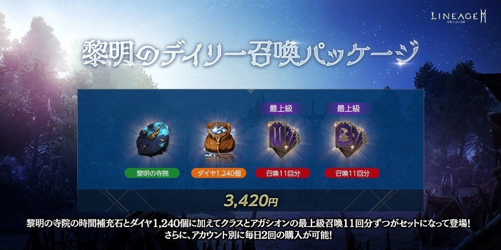 1日2回購入できる「黎明のデイリー召喚パッケージ」が登場しました。