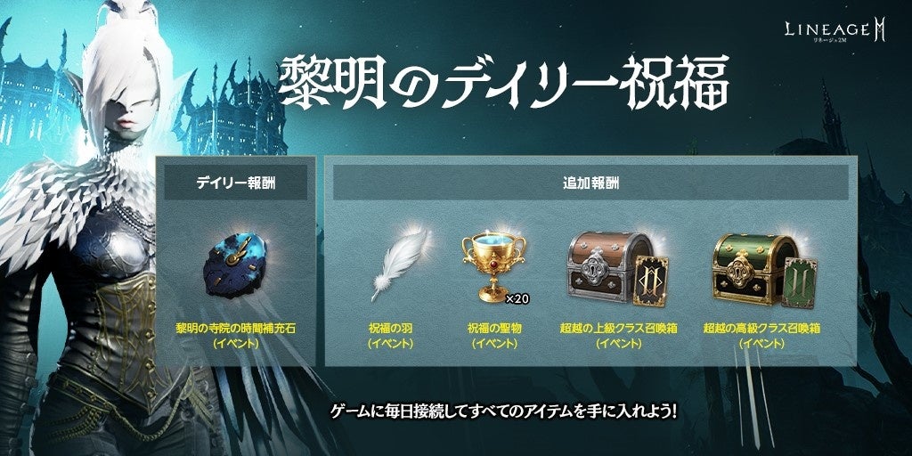 さらに、毎日正午に「超越のクラス召喚箱(イベント)」や「アインハザードの祝福」「ルーンスト―ン(刻印)」など冒険に役立つアイテムをゲーム内郵便にてお送りします。