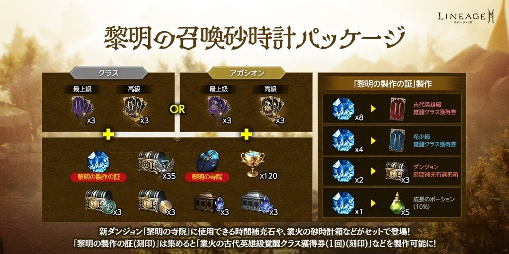 クラスまたはアガシオンの召喚66回分に、「業火の砂時計箱(刻印)」35個、「黎明の寺院の時間補充石(刻印)」、「黎明の製作の証(刻印)」などがセットになった「黎明の召喚砂時計パッケージ」が登場しました。
