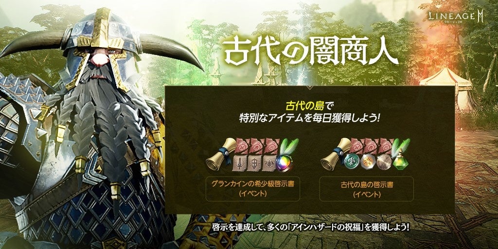 「バナミン(イベント)」から、アデナを使用することで、「古代の島」に関連したクエストなどが啓示される、「古代の島の啓示書(イベント)」や「グランカインの希少級啓示書(イベント)」を獲得できます。