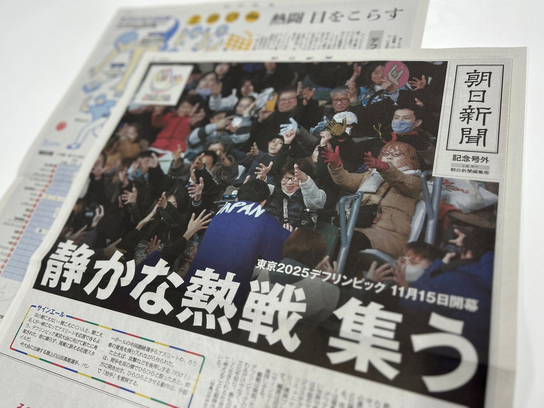 株式会社朝日新聞社(代表取締役社長CEO:角田克)は、11月15日(土)に開幕する聴覚障害者の国際スポーツ大会「第25回夏季デフリンピック競技大会 東京2025」のトータルサポートメンバーです。デフスポーツへの理解を促進し、本大会を盛り上げるため、「デフリンピック特別紙面」を発行しました。11月15日に東京体育館で行われる開会式に出展する「朝日新聞社」ブースで配布するほか、デフリンピックの大会期間中は競技会場内に設置配布します。(配布数限定)