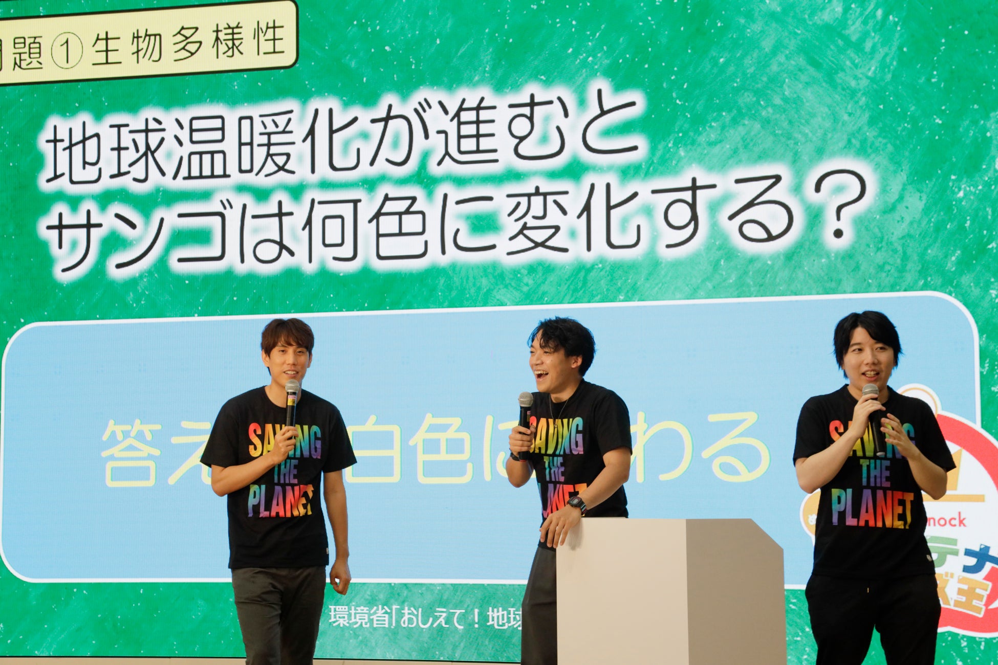イベント前半は、クイズ集団QuizKnock(クイズノック・伊沢拓司、須貝駿貴、こうちゃん)が、日本全国からオンラインで参加した47組とSDGsクイズで対戦した。「地球温暖化が進むとサンゴは何色に変化する?」(答えは「白色」)、「世界中で1年間に作られるペットボトルを繋げると地球を何周する?」(答えは「2400周」)、「一度海に漂った廃プラスチックは、その後何年間海を漂い続ける?」(答えは「400年」)という難易度の高い内容だったが、QuizKnockもオンラインチームも全問正解し、対決の結果は引き分けとなった。伊沢はオンラインチームの正解率に驚きつつ、「今日のクイズで覚えたことを『楽しかったね』っていうふうに済ますんじゃなく、今後、家での生活とかに生かしてほしいですね」というメッセージを送った。