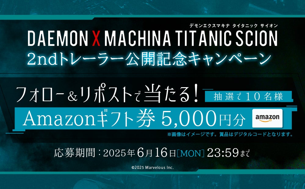 『DAEMON X MACHINA TITANIC SCION』2ndトレーラーの公開を記念したプレゼントキャンペーンを実施中です。公式X(@dxm_info)をフォローし、キャンペーン対象ポストをリポストして、ご参加ください。皆様のご応募お待ちしています。