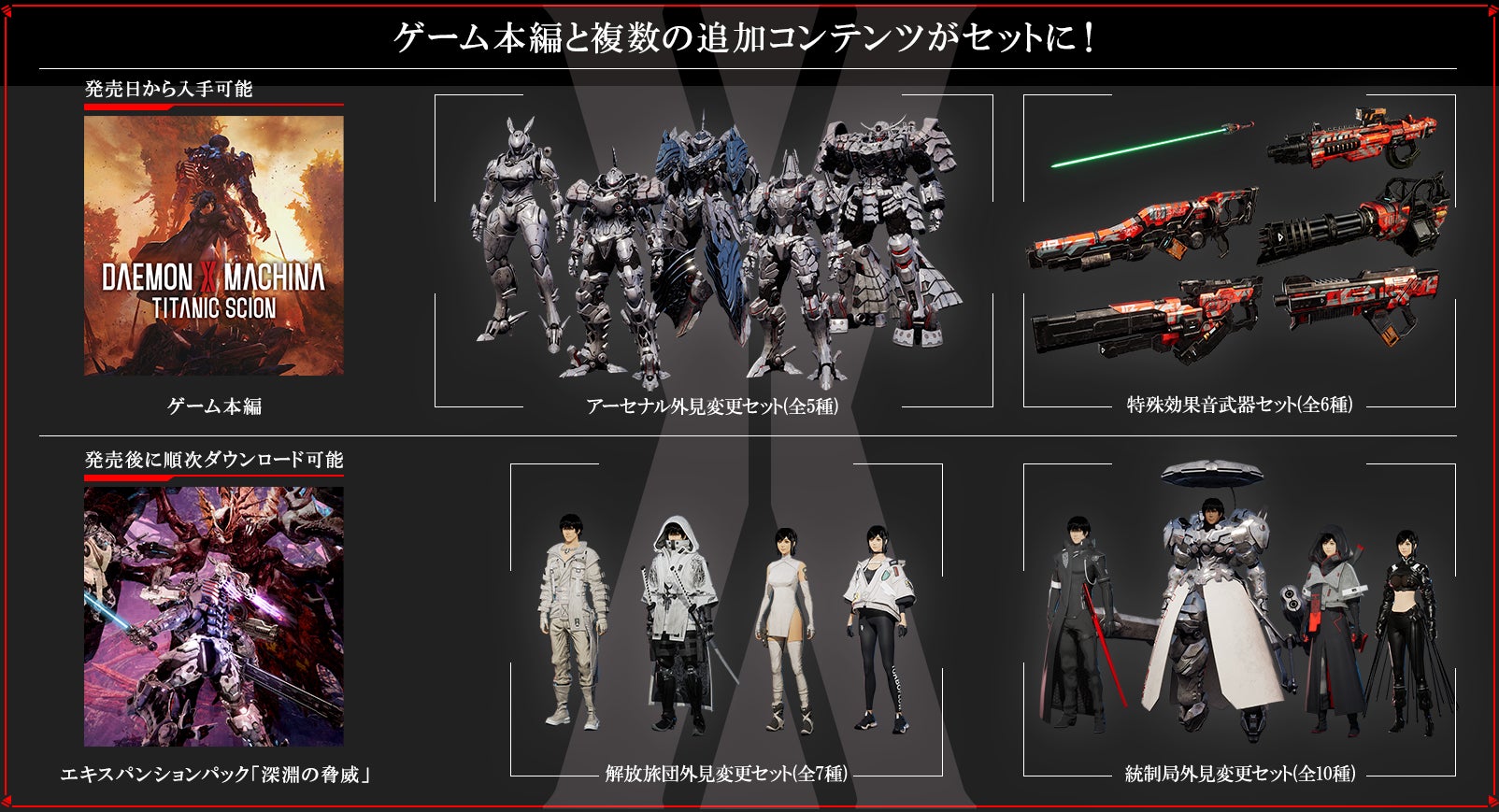 ※「特殊効果音武器セット」「アーセナル外見変更セット」「『DAEMON X MACHINA TITANIC SCION』デジタルアートブック&サウンドトラック」は発売日にお受け取りできます。その他「エキスパンションパック」「解放旅団外見変更セット」「統制局外見変更セット」は2025年配信予定となります。
