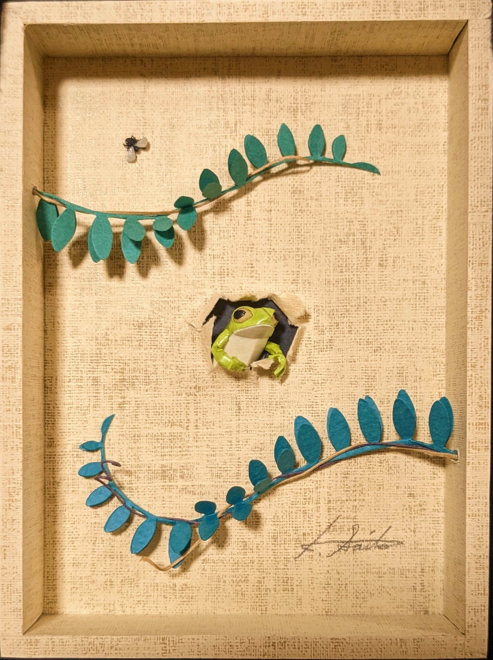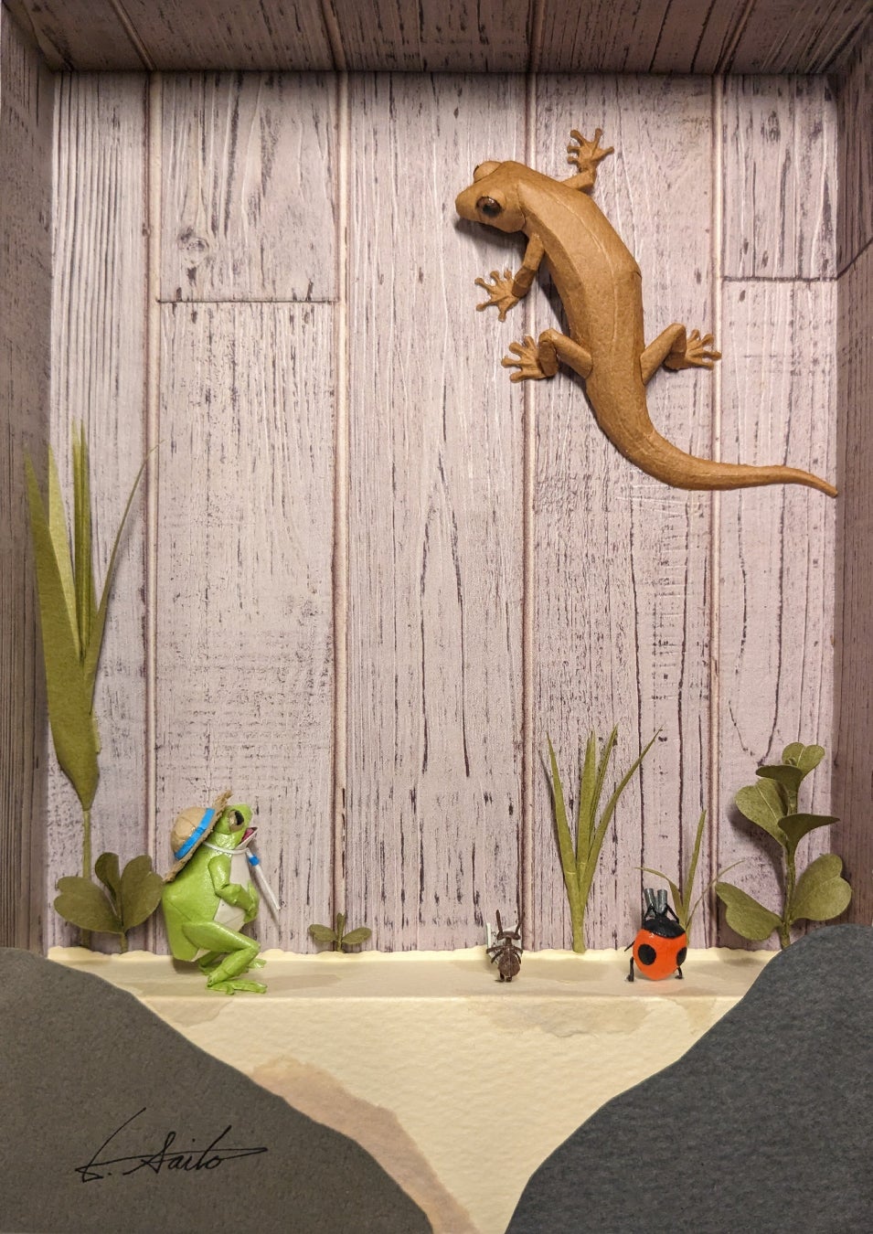 昨年大好評だった昆虫たちとともに、今年は新たなカエルの作品も登場します。「紙技工房」の手にかかれば、自然界で暮らす昆虫やカエルたちがそのままのサイズで、楽しく愉快な世界観、今にも動きだしそうな生き生きした表情で表現されます。細かい部分まで再現されたリアルな紙の昆虫やカエルたち、かわいらしく擬人化された作品など多数展示いたします。