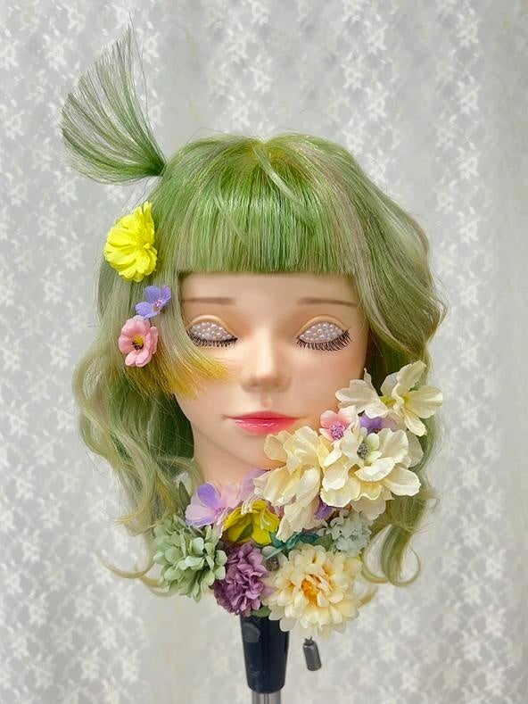 幸運がとどまる透明で儚い瞬間をイメージして制作しました。クローバーが好きで、四葉に込められた「幸運」の意味と可愛らしさに惹かれて取り入れています。全体的に髪をふんわりさせ、儚さを表現しています。