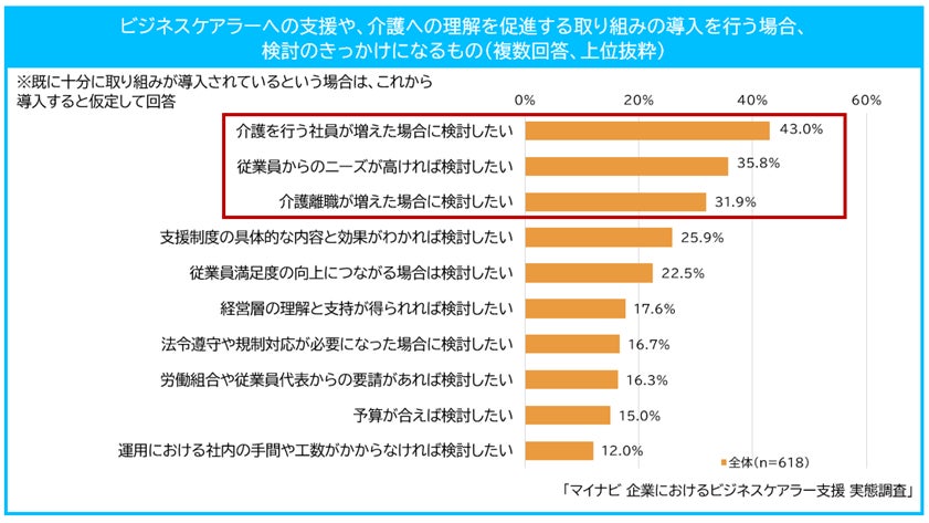 「ビジネスケアラー」支援を促進するきっかけとなるのは「介護を行う社員が増えた場合」が43.0%で最多、次いで「従業員ニーズが高ければ」(35.8%)、「介護離職が増えた場合」(31.9%)となった。団塊の世代が75歳以上となり、国民の5人に1人が後期高齢者という超高齢化社会を迎える、いわゆる「2025年問題」が目前に迫るなか、課題が顕在化してから取り組みたいと考える企業が多い現状がわかった。介護は従業員が会社に状況を伝えづらい点が指摘されているが、「ビジネスケアラー」と企業の温度差は改善すべき点であり、まずは社員の実態を把握することが一歩目の課題解決につながるといえる。