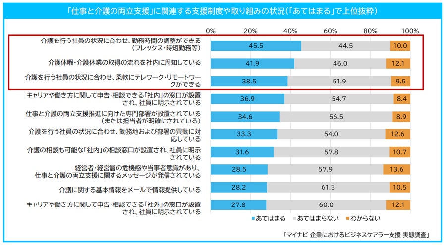 ◆現在「介護を行う社員の状況に合わせ、勤務時間の調整ができる」企業は45.5%で最多