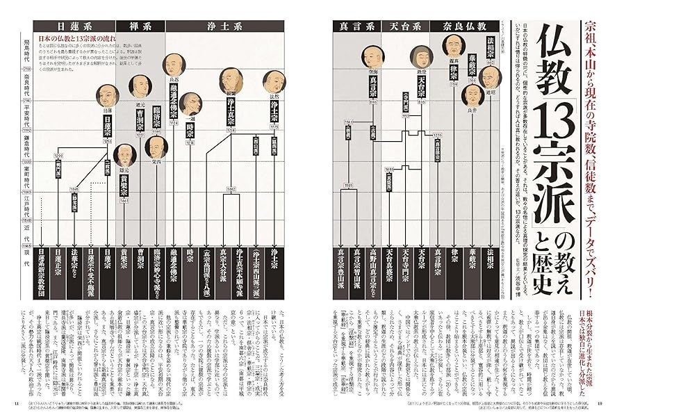 釈迦の悟り、仏教伝来後の聖徳太子の尽力、「13宗派」の教えと成り立ち、仏教界の革命児・空海の偉業、鎌倉新仏教の誕生等々、一見難しい日本の仏教の歴史ですが、イラストや写真を惜しみなく掲載して初心者にもわかりやすく解説しています。