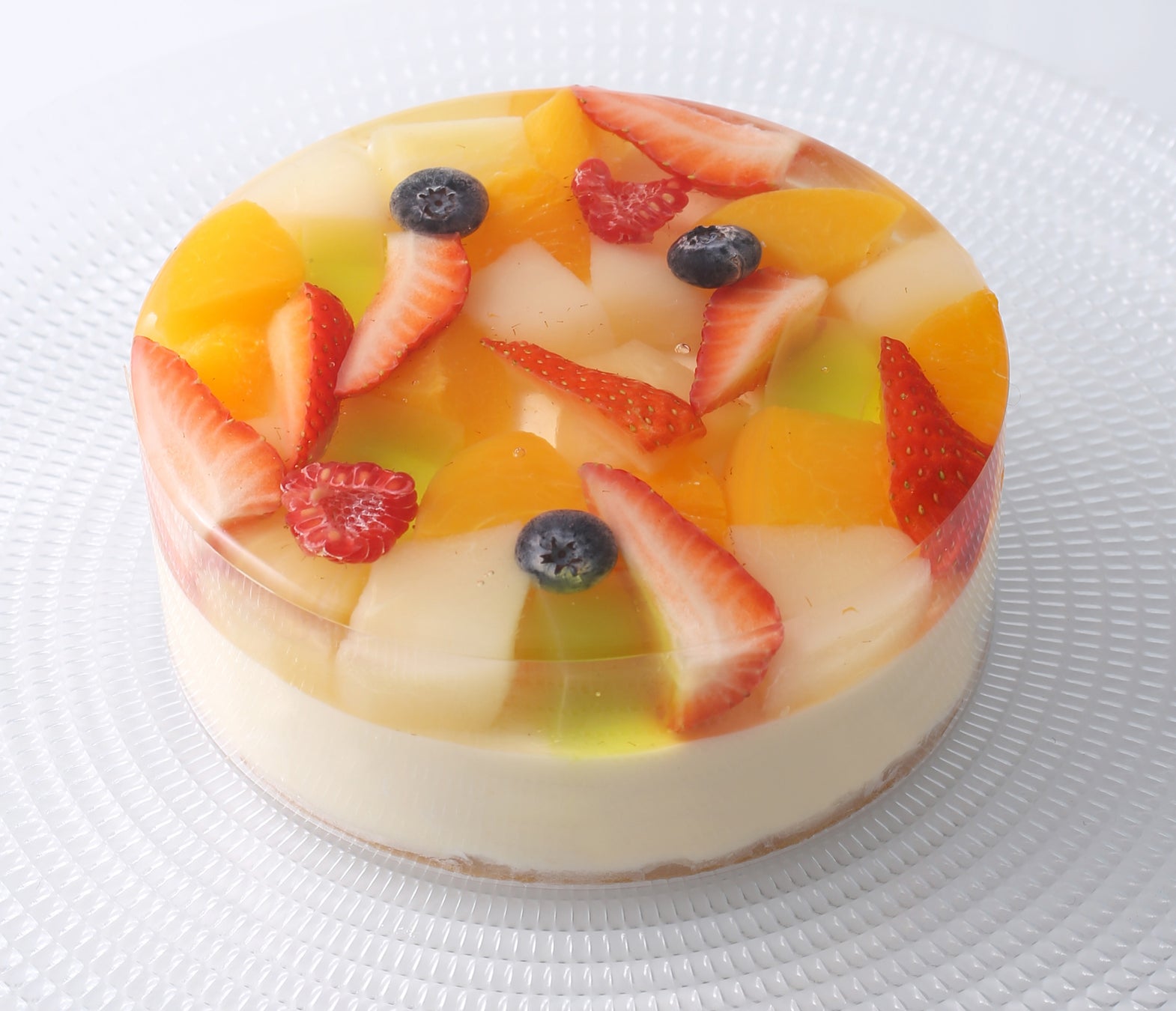 クッキー生地にまろやかなバニラのババロワを重ね、彩りフルーツをとじこめたゼリーを重ねました。