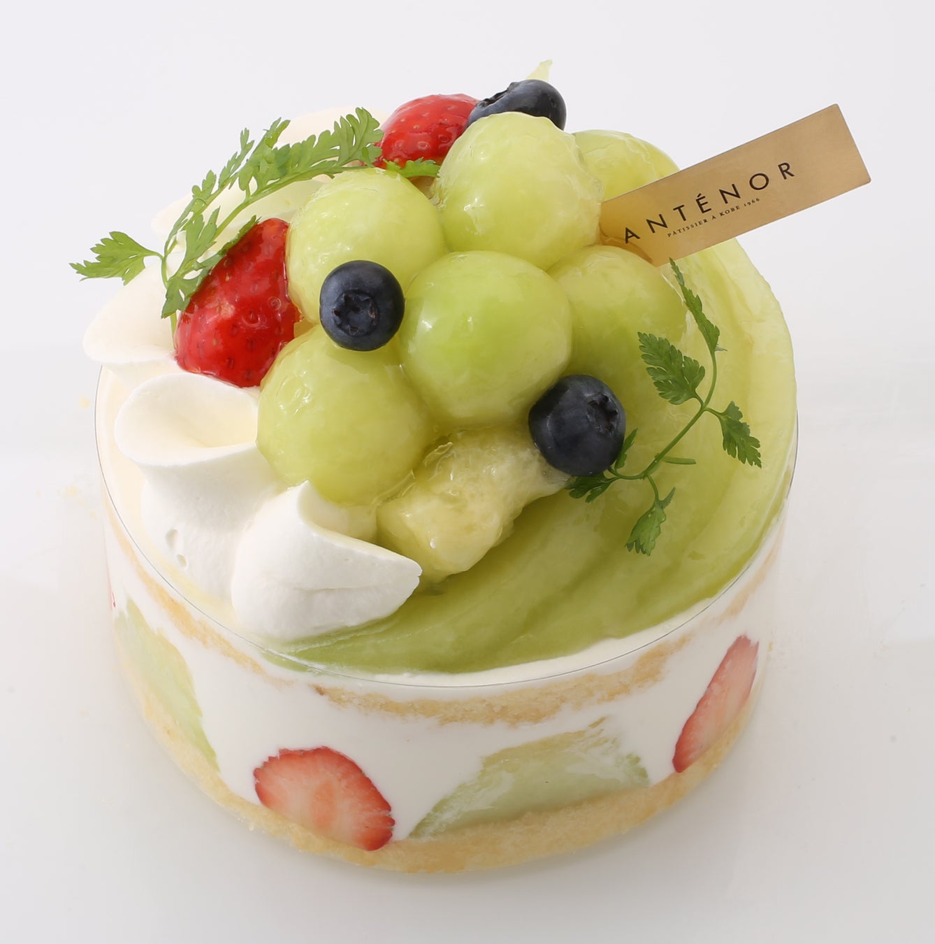 メロンを贅沢に飾った夏限定ケーキ。ミルク感豊かなクリーム、苺、メロンを、しっとり焼き上げたスポンジケーキにサンドしました。