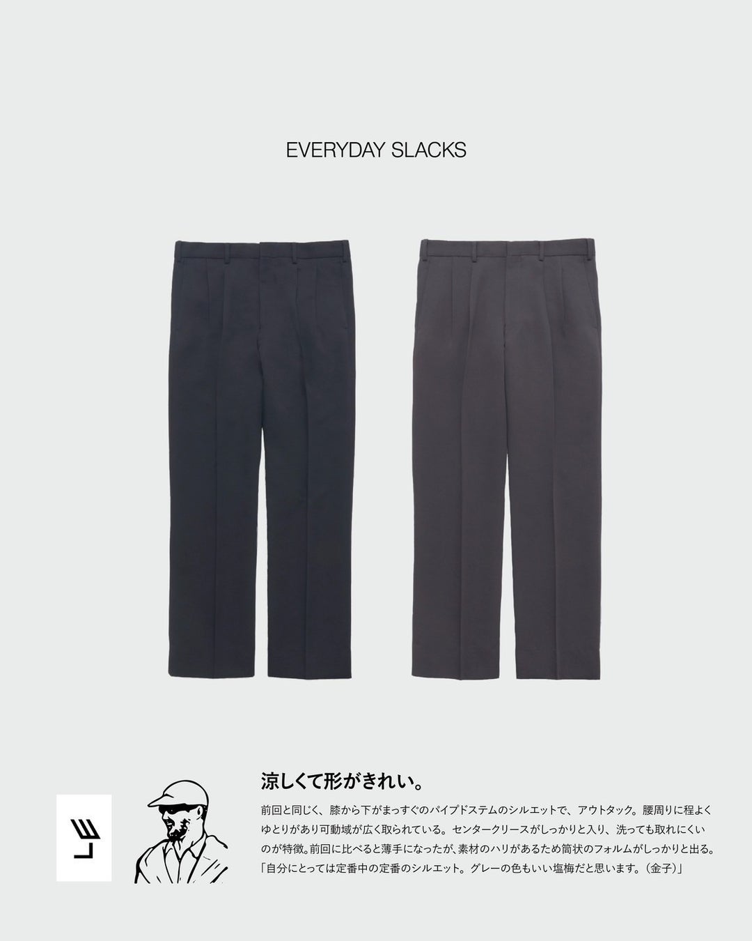 24AWに展開したLEのエブリデイスラックス。大好評を博し、あっという間に在庫がなくなってしまい、再販の声が多く寄せられていたが、春夏用の素材をまとって新たにリリースされる。使いやすさはそのままに、やや軽く、春から夏にかけて活躍する。シルエットはしっかり出て、クリースも消えにくいけれど重くならないバランスを探った。
