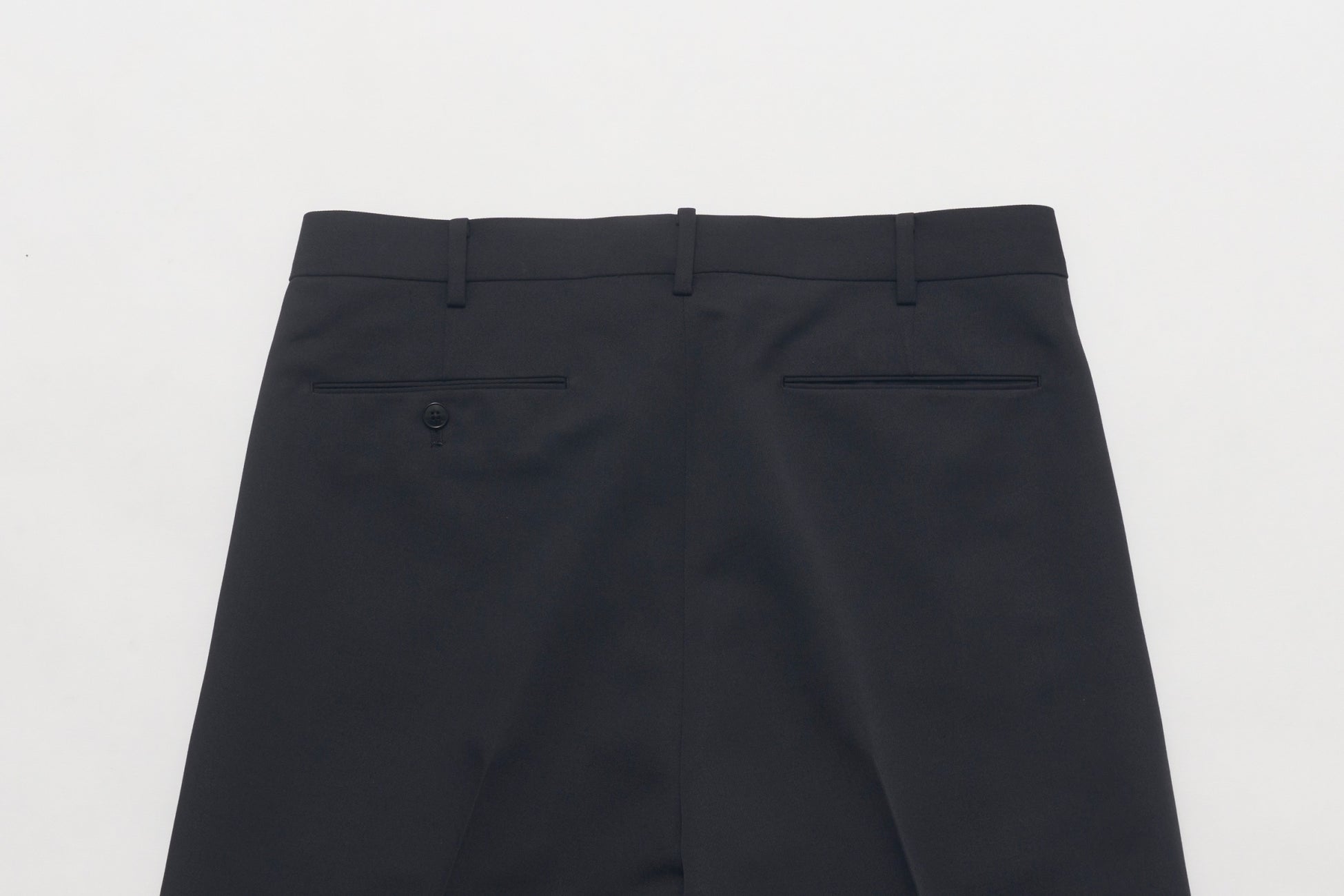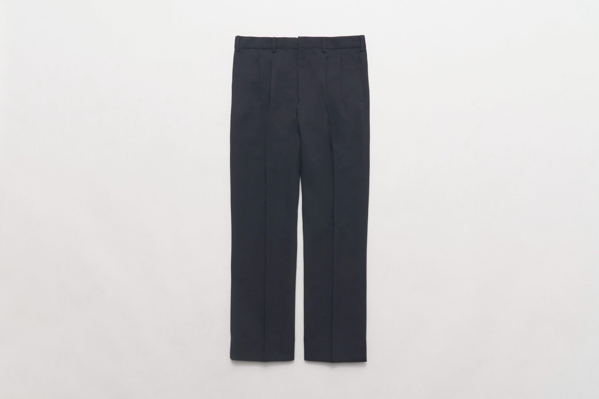 ゆとりがあり可動域が広く取られている。センタークリースがしっかりと入り、洗っても取れにくいのが特徴。前回に比べると薄手になったが、素材のハリがあるため筒状のフォルムがしっかりと出る。
