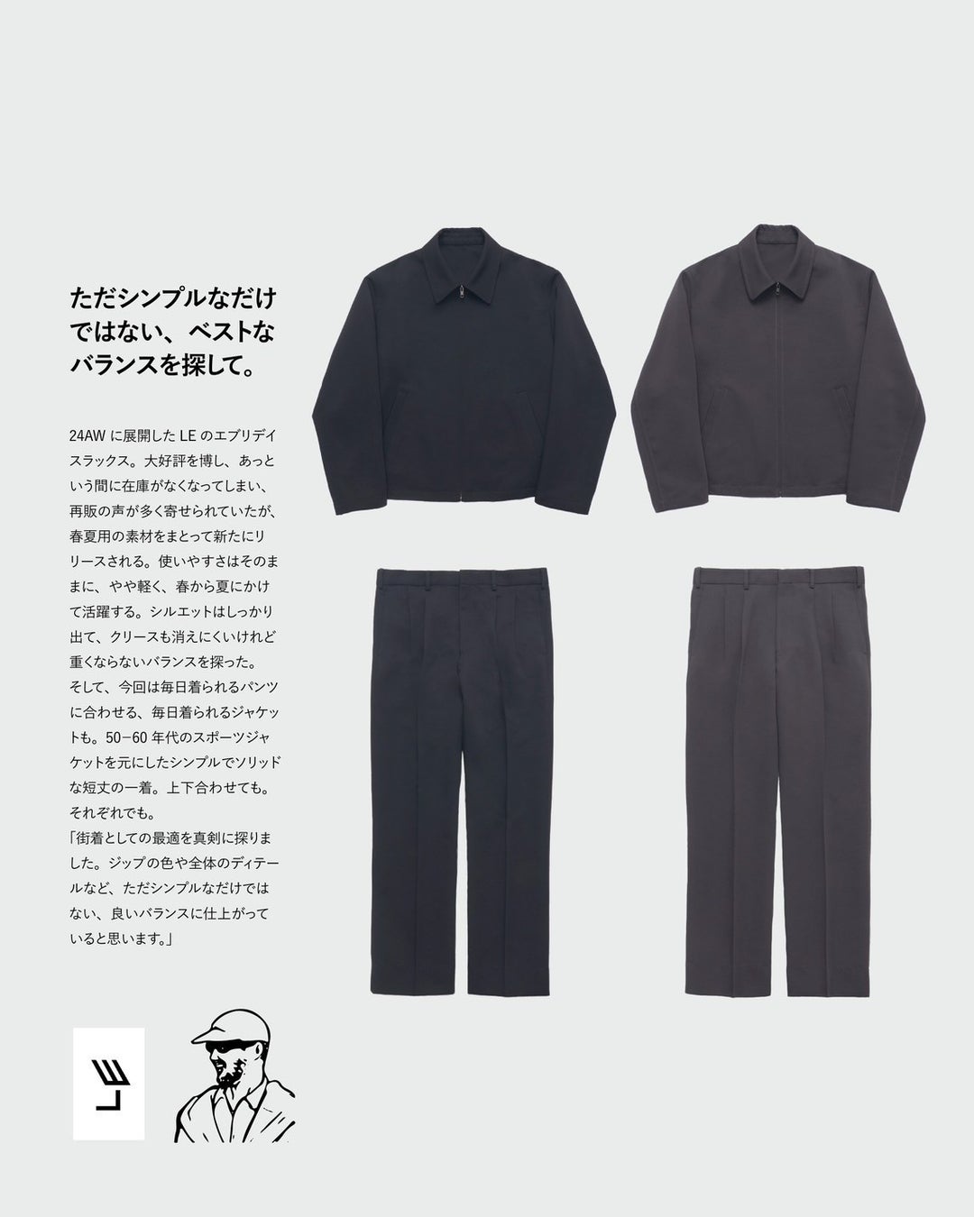 24AWに展開したLEのエブリデイスラックス。大好評を博し、あっという間に在庫がなくなってしまい、再販の声が多く寄せられていたが、春夏用の素材をまとって新作ブルゾンと共に新たにリリースされる。