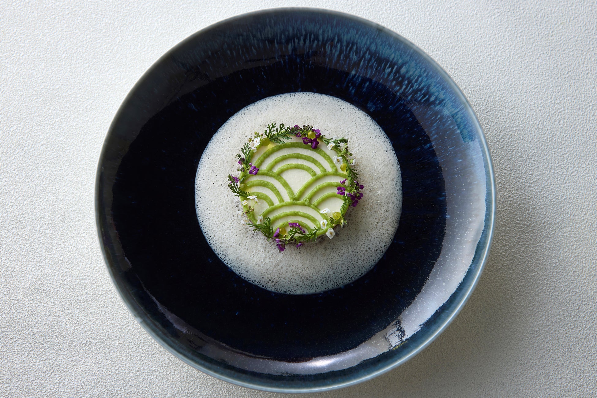 THE RAYのシグネチャーメニューである、あたたかみのある清水焼天目茶碗でご提供するスープに始まり、ミント香るズッキーニのソースで描いた模様が見た目も涼やかな「岩手県赤鶏と豚足のゼリー寄せ」をご用意。この季節ならではの食材を活かした品々が揃います。