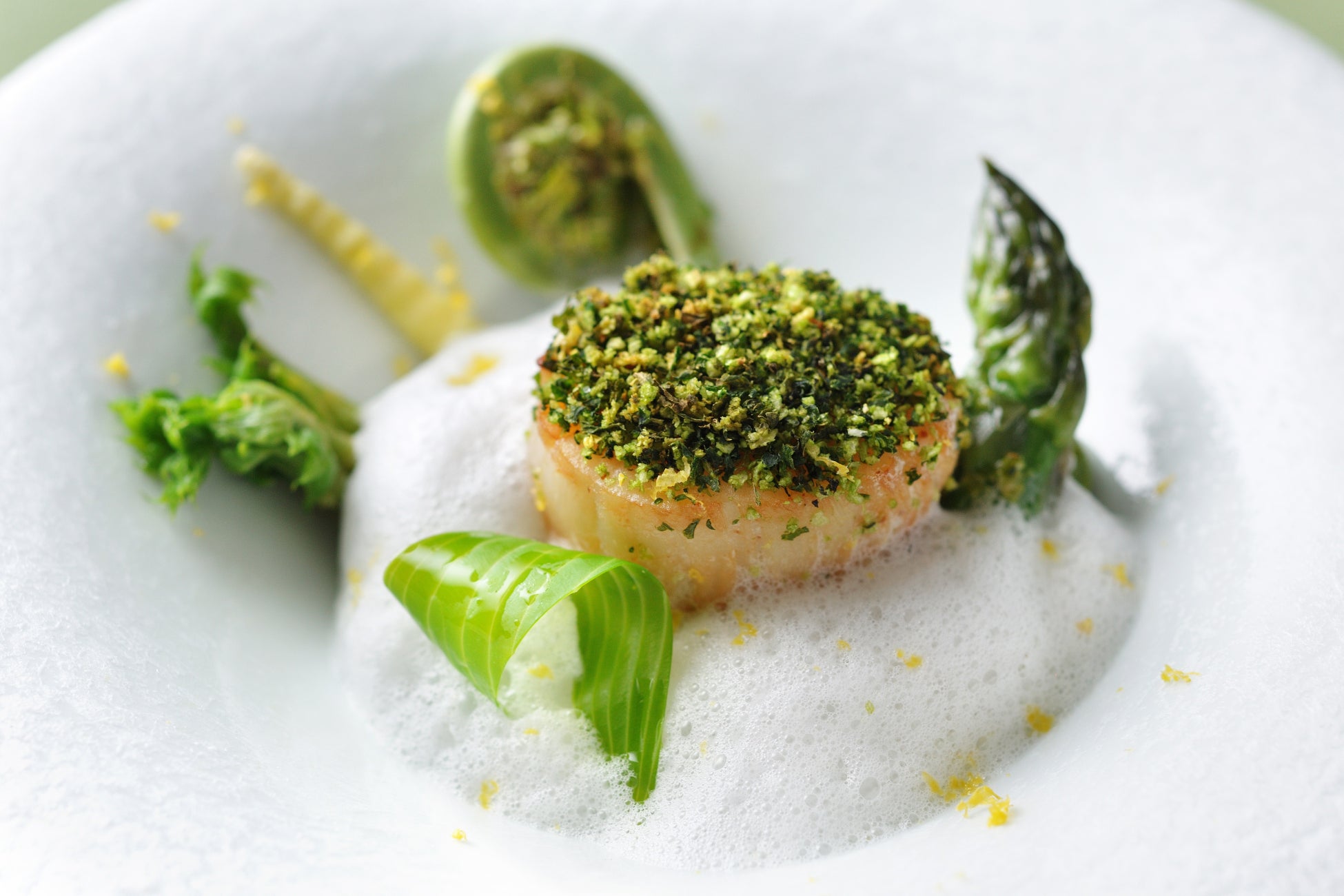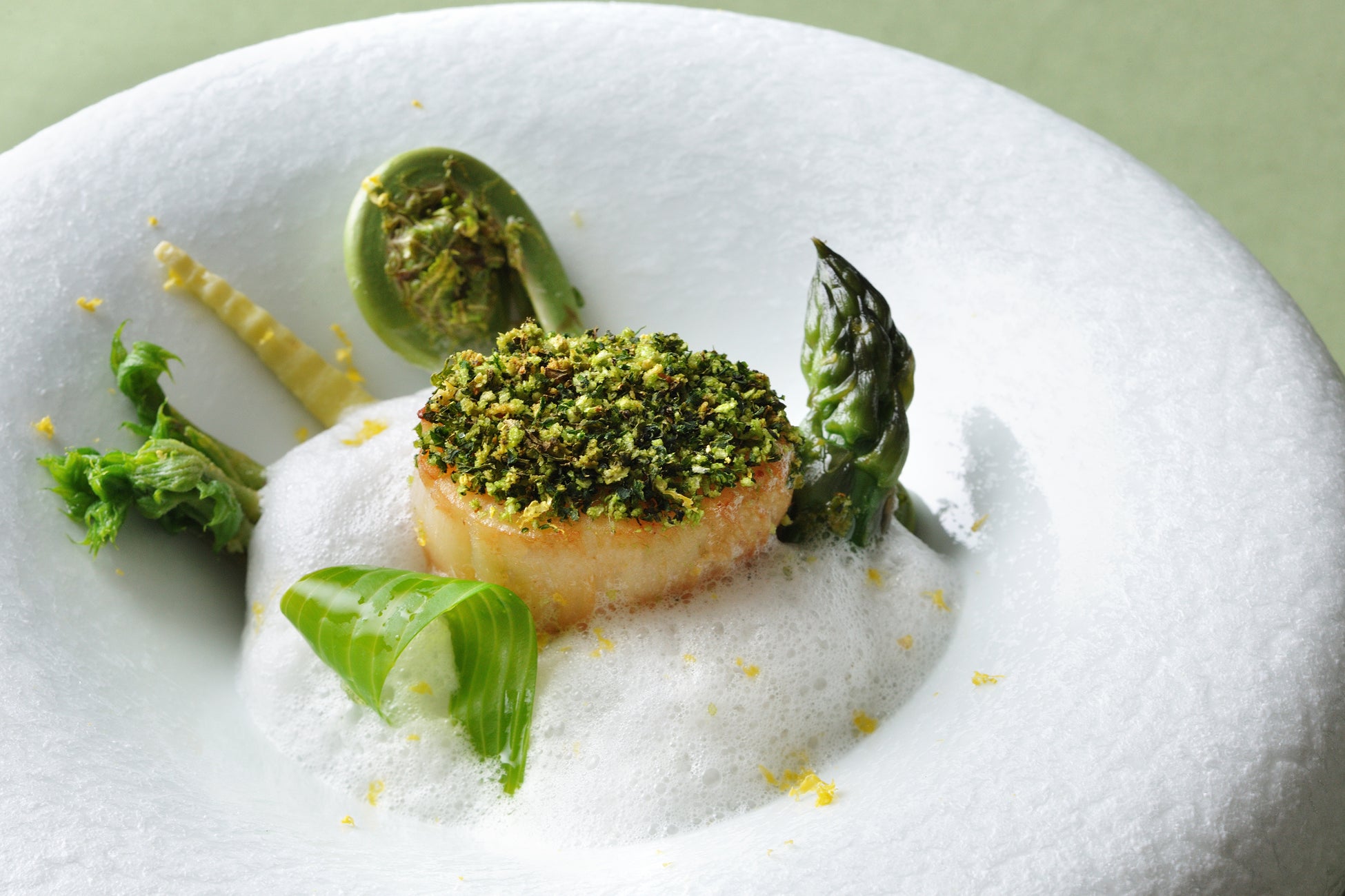 アスパラガスや根曲がり茸など北海道ならではの春野菜を、魚介の旨みを凝縮した軽やかな泡が優しく包み込みます。その上に、香草パン粉とともに香ばしく焼き上げたホタテを盛り付けました。ホタテの柔らかな甘み、多彩な野菜の食感、そして魚介の旨み溢れる泡が一体となって、春の訪れを華やかに告げます。