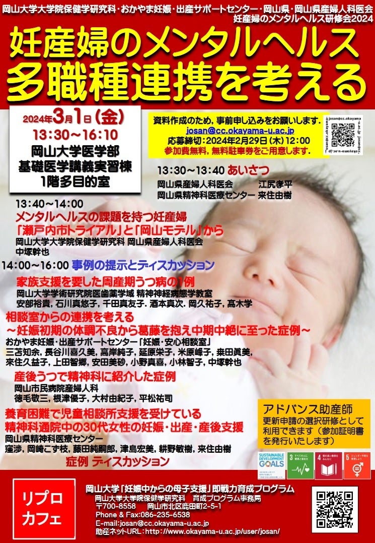 国立大学法人岡山大学(本部:岡山市北区、学長:那須保友)では、2024年3月1日(金)14:00~16:40に「妊産婦のメンタルヘルス研修会2024 妊産婦のメンタルヘルス 多職種連携を考える」を本学鹿田キャンパスの医学部基礎医学講義実習棟1階多目的室で開催します。