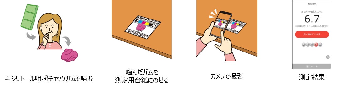 キシリトール咀嚼チェックガムは、「唾液の量」「咬み合わせの面積」「舌の力」「唇・舌・顎関節の運動機能」など複合的な因子で総合的に咀嚼能力を評価することができます。(株式会社オーラルケアから販売されています)