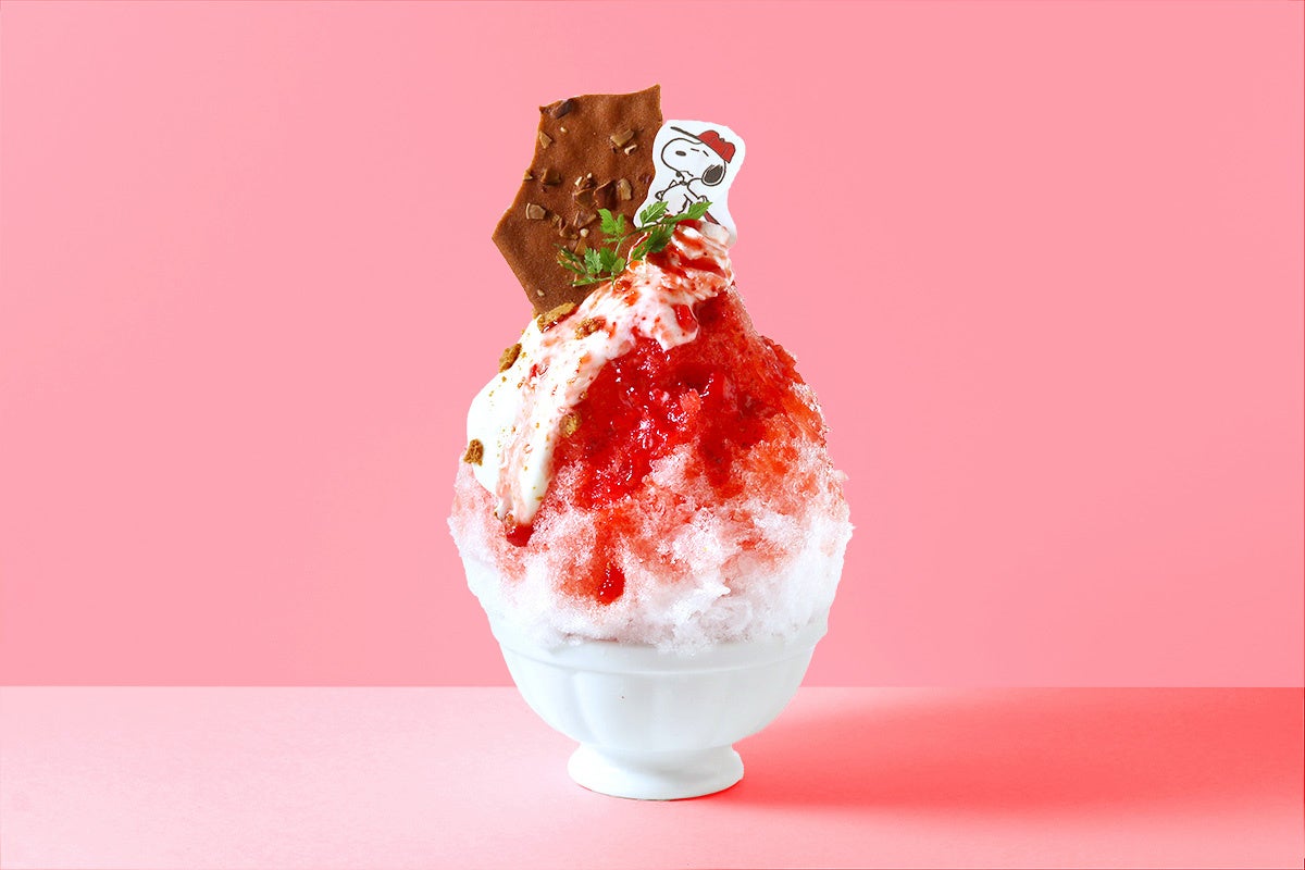 ベースボールを楽しむスヌーピーのキャップカラーに合わせた、真っ赤なイチゴのかき氷。