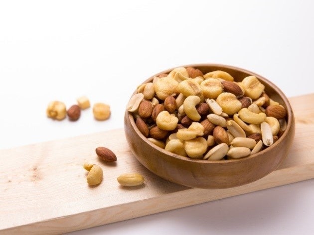 桜のチップでじっくり燻製しスモーキーな香りがしっかり乗ったアーモンド、カシューナッツ、ジャイアントコーン、バターピーナッツの4種類のナッツにコクのある約1センチ角のフリーズドライチーズをミックス。