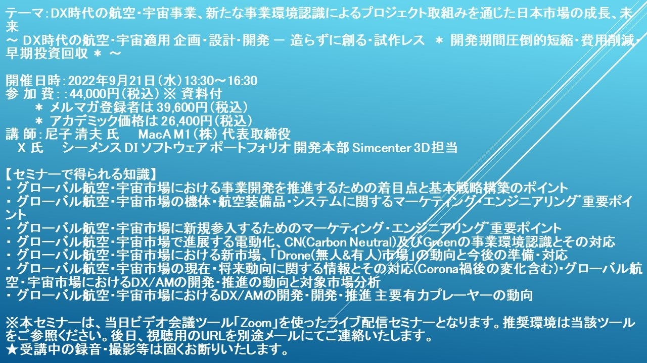 先端技術情報や市場情報を提供している(株)シーエムシー・リサーチ(千代田区神田錦町: https://cmcre.com/ )では、 各種材料・化学品などの市場動向・技術動向のセミナーや書籍発行を行っておりますが、 このたび「DX時代の航空・宇宙事業、新たな事業環境認識によるプロジェクト取組みを通じた日本市場の成長、未来」と題するセミナーを、 講師に尼子 清夫 氏 MacA M1(株) 代表取締役)をお迎えし、2022年9月21日(水)13:30より、 ZOOMを利用したライブ配信で開催いたします。 受講料は、 一般:44,000円(税込)、 弊社メルマガ会員:39,600円(税込)、 アカデミック価格は26,400円(税込)となっております(資料付)。