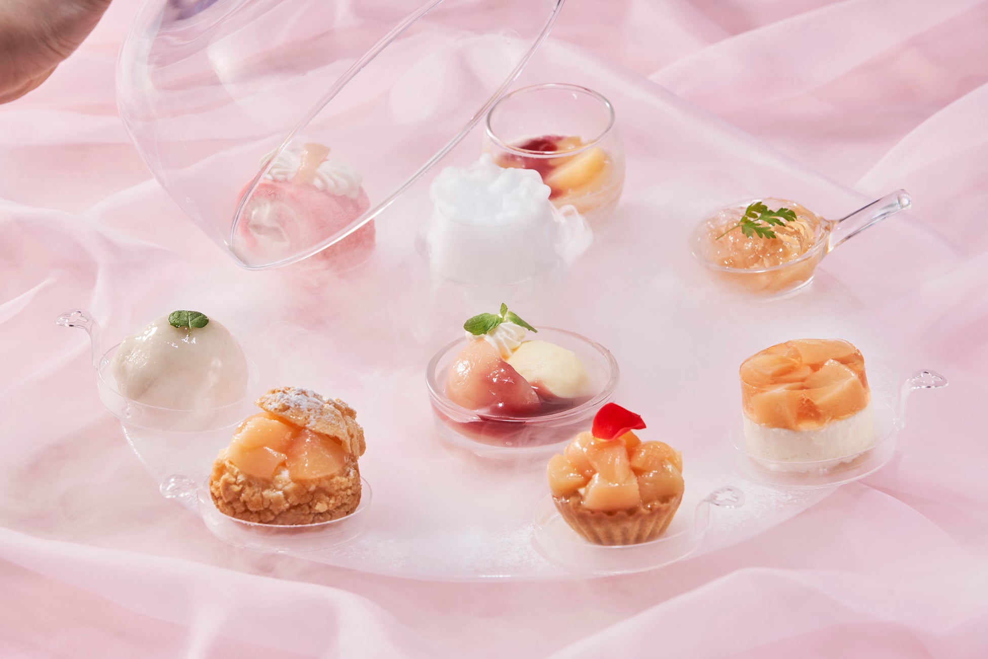 ガラスのクロッシュを開けると、ふわりと立ちのぼる白いスモークとともに、桃の甘く上品な香りがほのかに広がります。中から現れるのは、ベリーのソースがアクセントとなった「ピーチメルバ」。その周りには、とろけるような口あたりと桃のやさしい甘みが広がる「桃のレアチーズケーキ」や、サクサクのタルト生地とジューシーな桃が絶妙に調和した「桃のタルト」など、趣向を凝らした桃スイーツが美しく並びます。全8種の桃スイーツが織りなす、桃づくしの贅沢な味わいがこの季節だけのティータイムを華やかに彩ります。