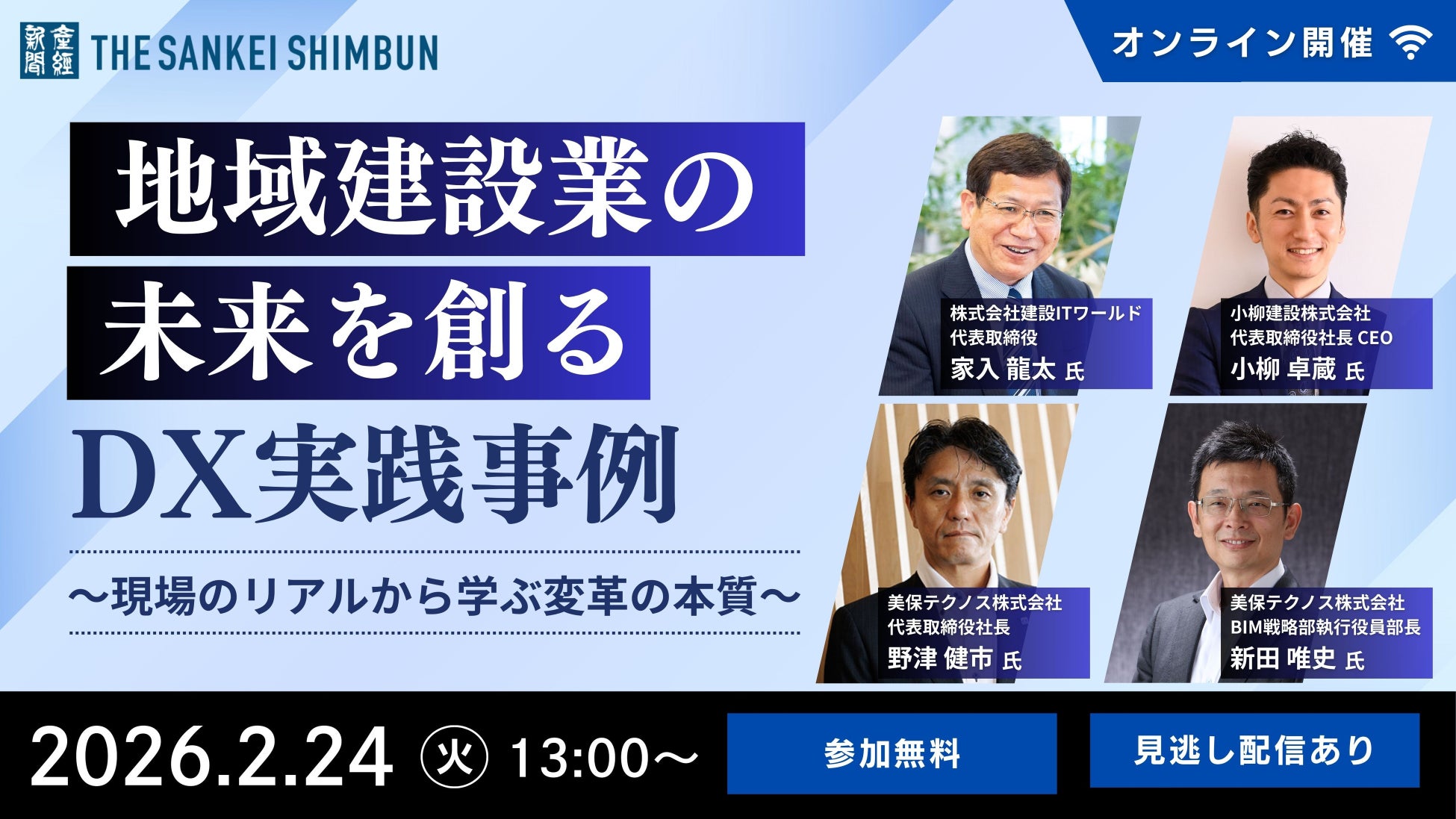 産経新聞社(東京都千代田区、社長・近藤哲司)は、セミナー「地域建設業の未来を創るDX実践事例 ~現場のリアルから学ぶ変革の本質~」を、2月24日(火)13時からオンラインで開催。参加者を募集します。