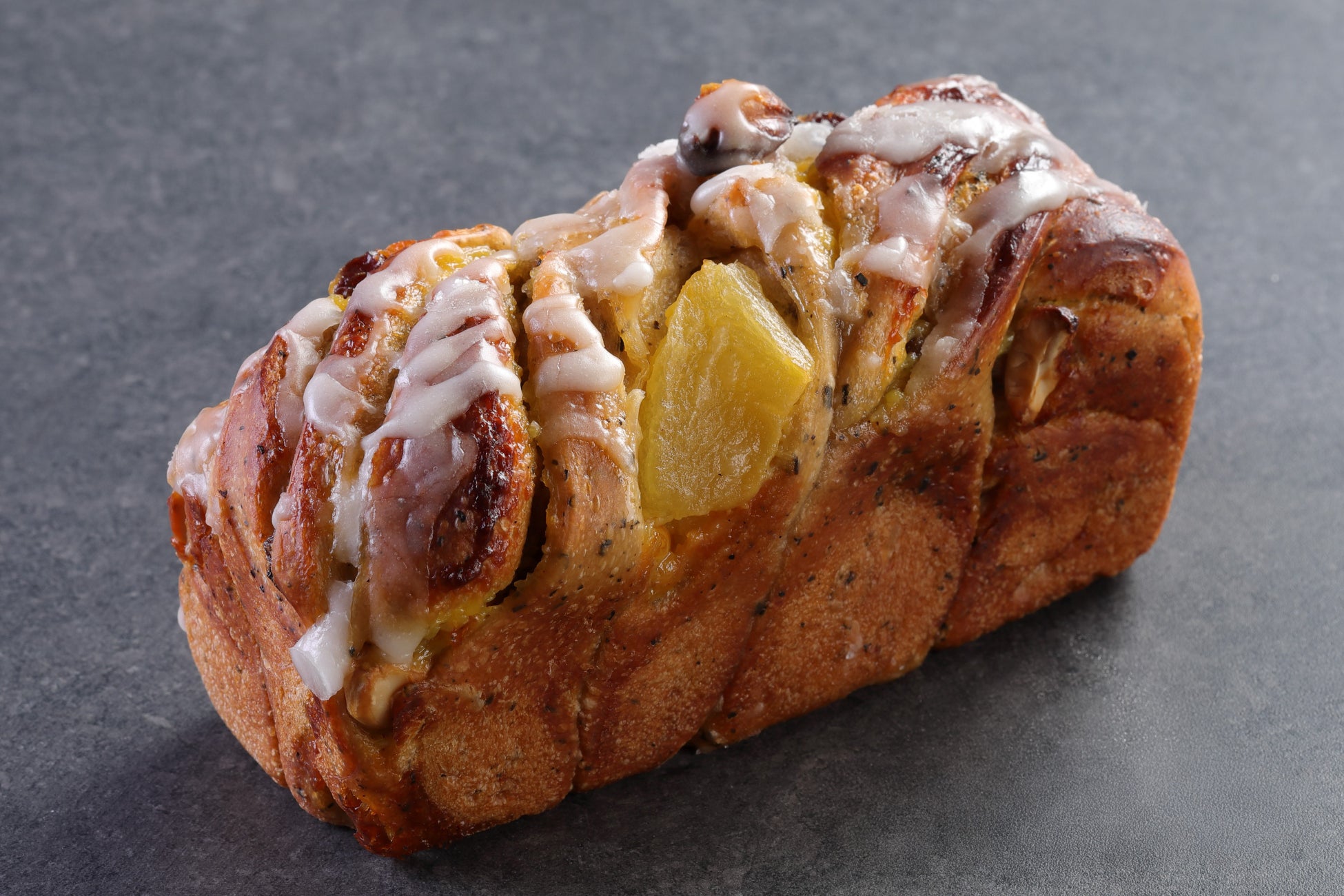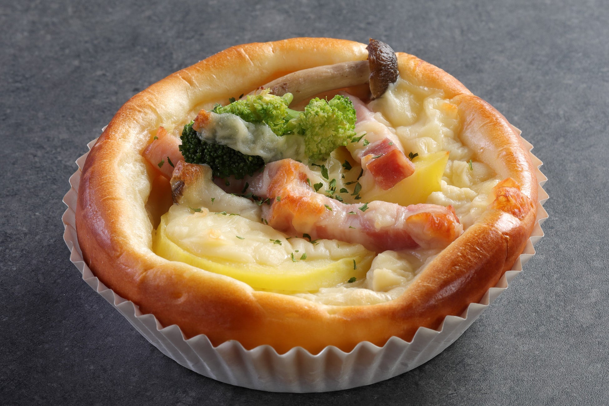 バター風味のパン生地にベシャメルソース、じゃがいも、ベーコン、ブロッコリー、玉ねぎ、しめじをトッピングし、焼き上げました。シチューのような濃厚な味わいをお楽しみいただける、寒くなる季節にぴったりな惣菜パンです。
