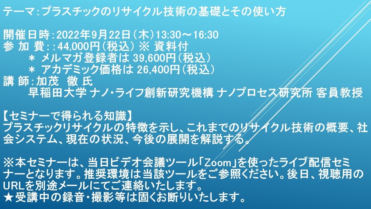 先端技術情報や市場情報を提供している(株)シーエムシー・リサーチ(千代田区神田錦町: https://cmcre.com/ )では、 各種材料・化学品などの市場動向・技術動向のセミナーや書籍発行を行っておりますが、 このたび「プラスチックのリサイクル技術の基礎とその使い方」と題するセミナーを、 講師に加茂 徹 氏 早稲田大学 ナノ・ライフ創新研究機構 ナノプロセス研究所 客員教授)をお迎えし、2022年9月22日(木)13:30より、 ZOOMを利用したライブ配信で開催いたします。 受講料は、 一般:44,000円(税込)、 弊社メルマガ会員:39,600円(税込)、 アカデミック価格は27,500円(税込)となっております(資料付)。