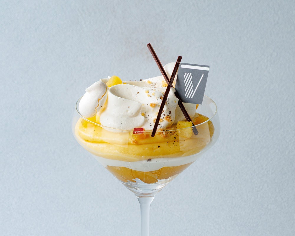 【大熊町賞】国際TBC調理・パティシエ専門学校(栃木県)・黒﨑翔太さん×MAISON GIVRÉE(メゾンジブレー)オーナーパティシエ・江森宏之 / ゴールドキウイのソース、ミルクパンナコッタ、キウイシャーベット、ミルクソフトクリームを重ね、キウイのギモーブ(マシュマロ)をとトッピングした盛りだくさんの一品です。