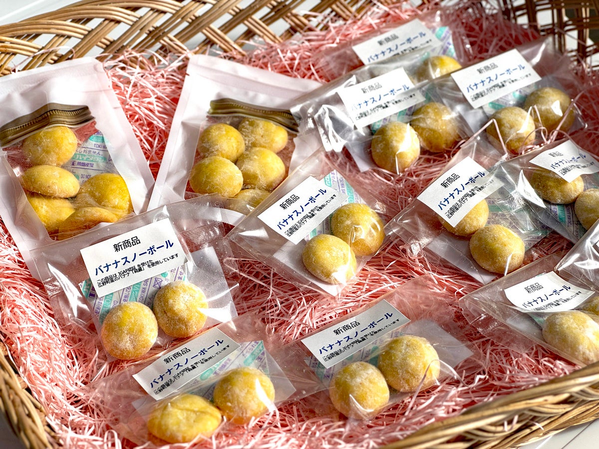 (5個入り・税込200円)販売元:福島県立ふたば未来学園高校 / 「朝陽(あさひ)に輝く水平線がとても綺麗(きれい)なみかんの丘のある町のバナナ」(愛称「綺麗」)のフリーズドライを生地に練り込み、口溶けがよく、バナナの素材のおいしさが感じられるよう工夫しました。