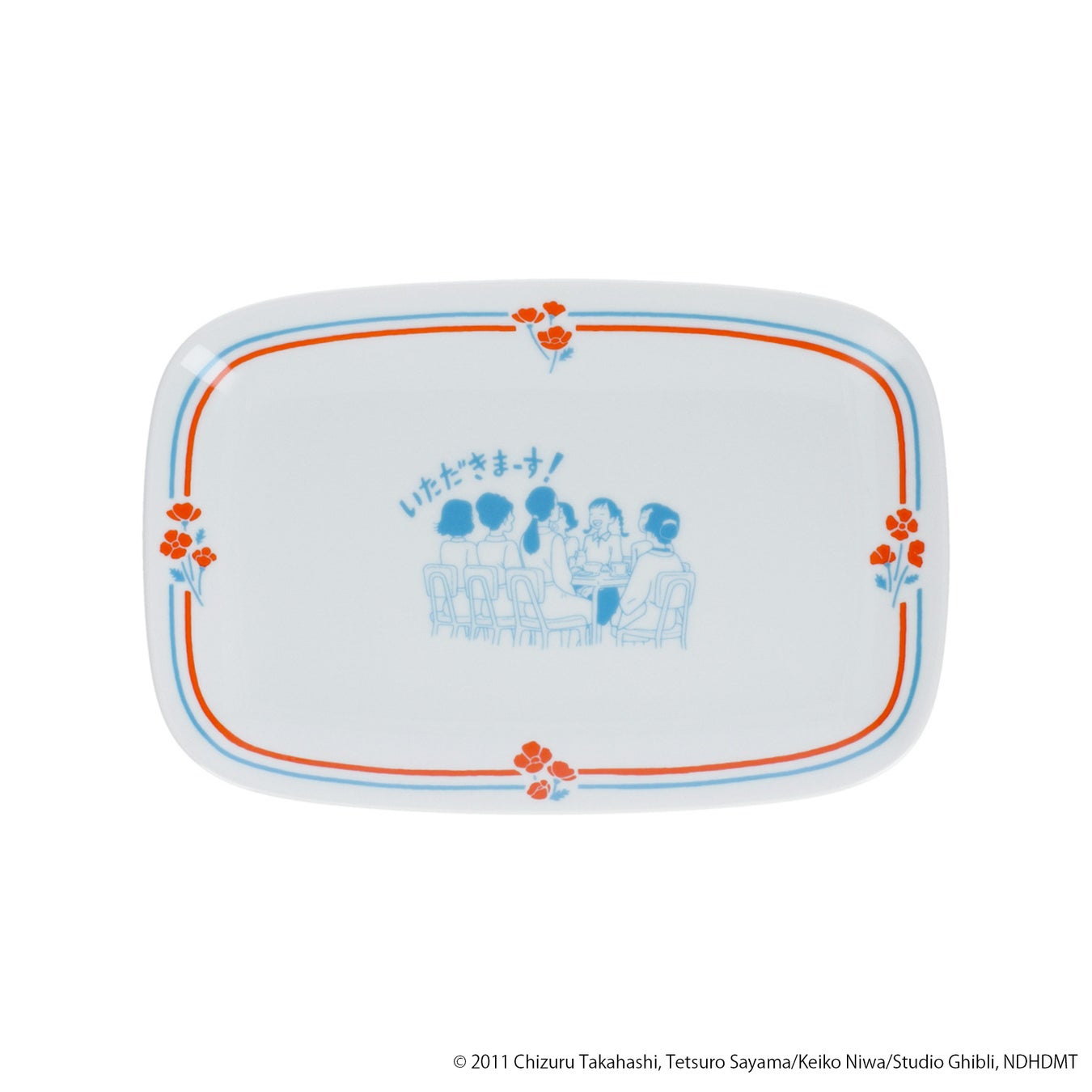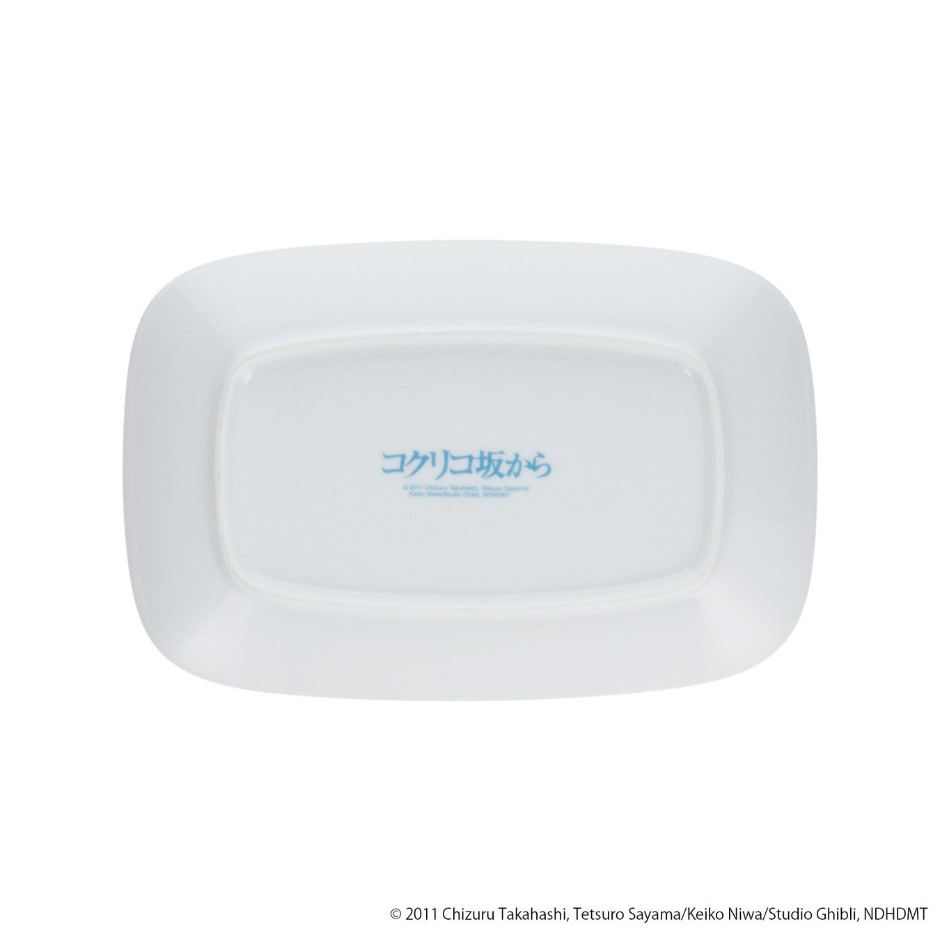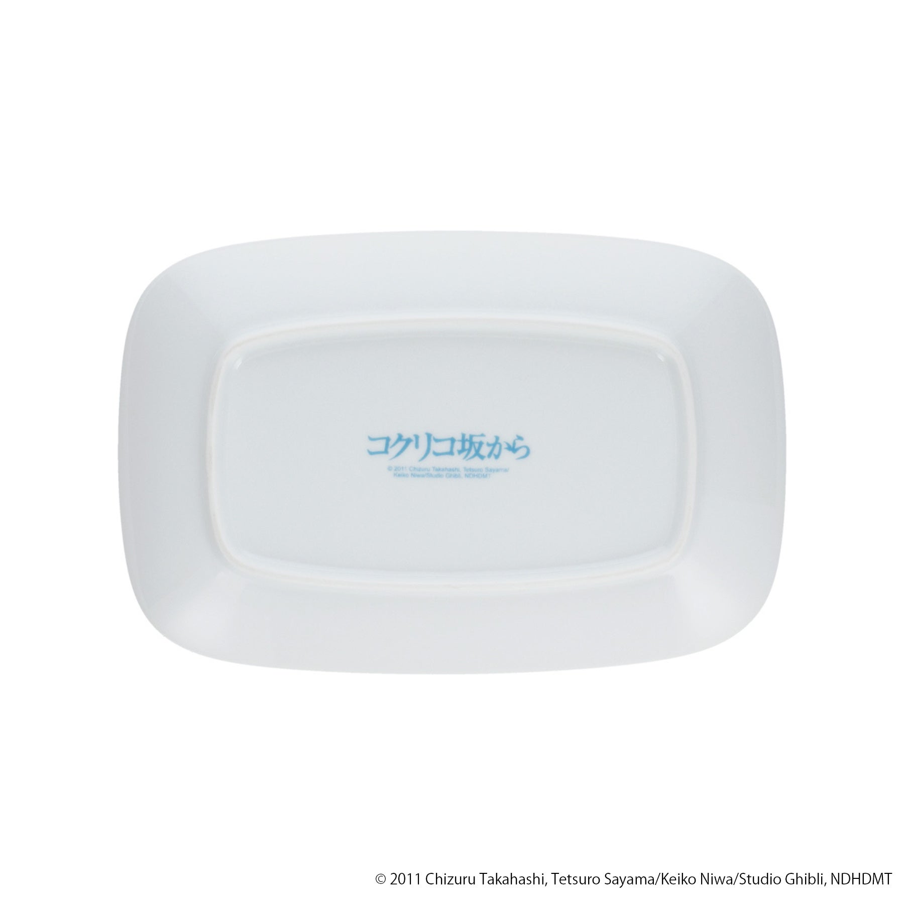 『コクリコ坂から』のオープニングで描かれる、主人公・海の家「松崎家」の朝食風景をデザインしたスクエアプレートです。作品の時代背景に合わせてレトロな白い陶磁器の素材を採用し、くすんだブルーとオレンジのカラーでデザインしました。ハムエッグやサラダを乗せて家族で食卓を囲めば、作中のワンシーンを再現できます。